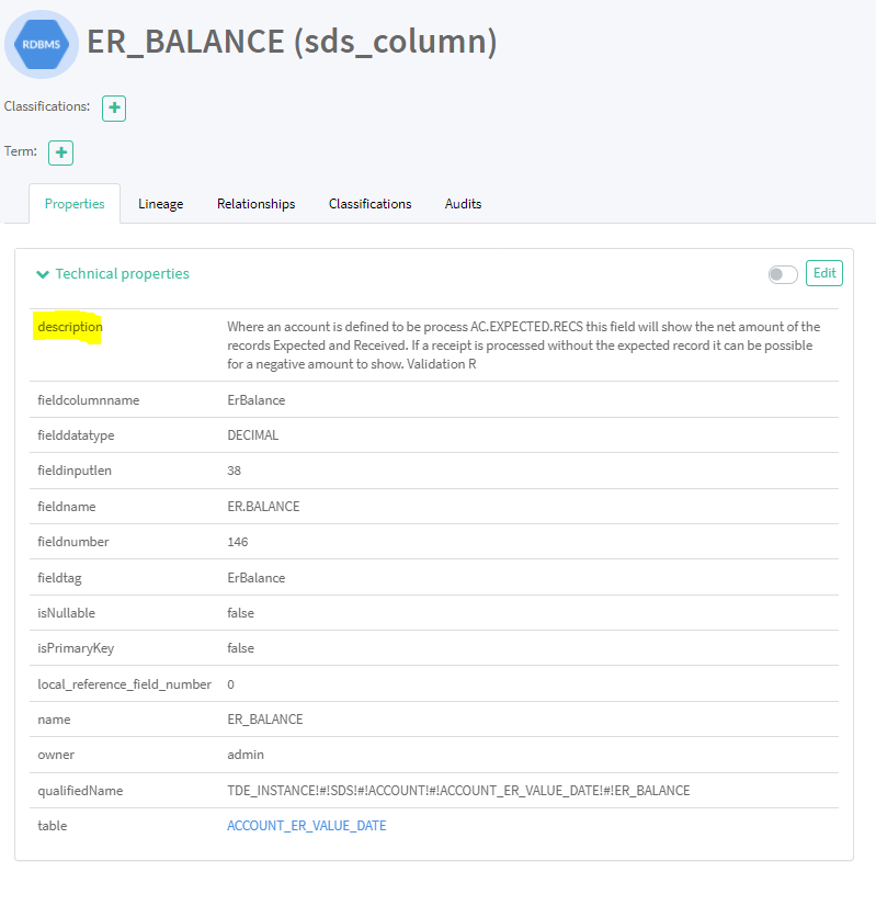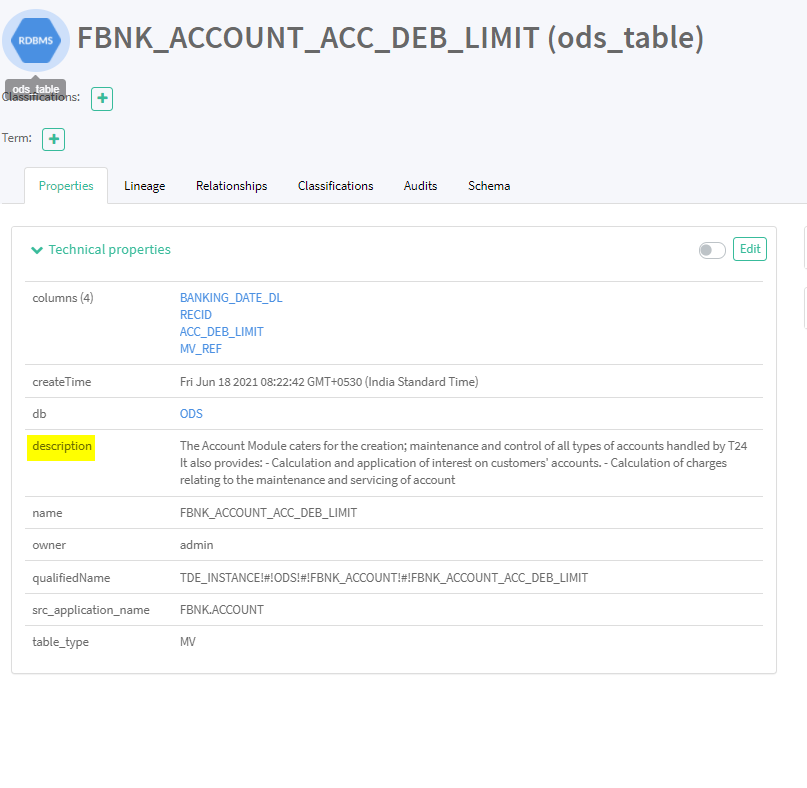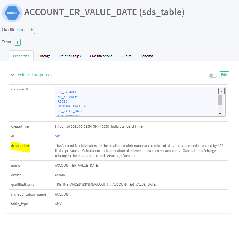 The business definition of table and column entities of ods_table, ods_column, sds_table and sds_column types is captured against the Description attribute. Metadata related to ODS and SDS tables are synchronised with atlas, creating entities of the following types.
