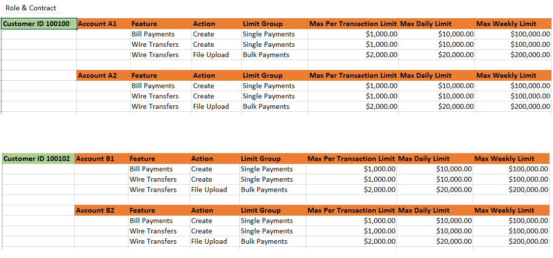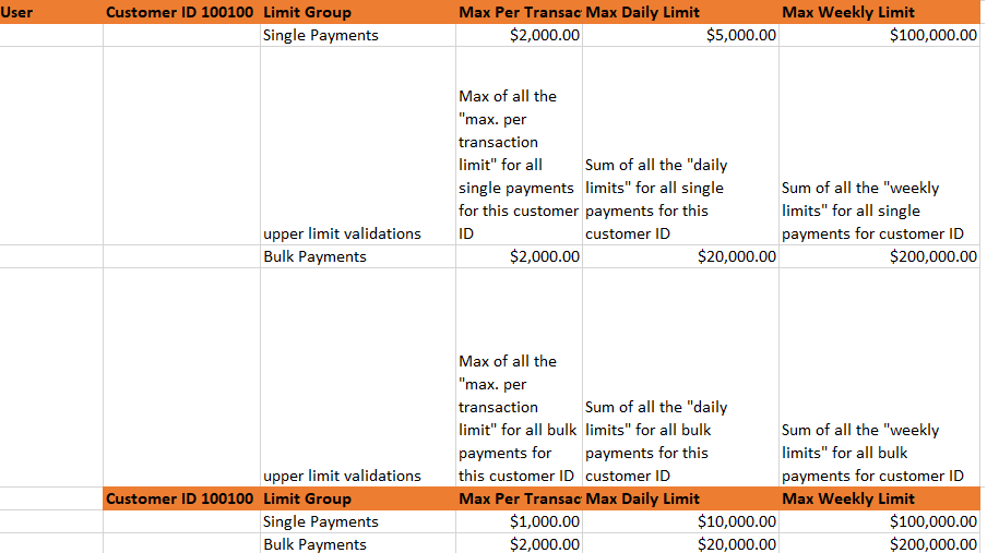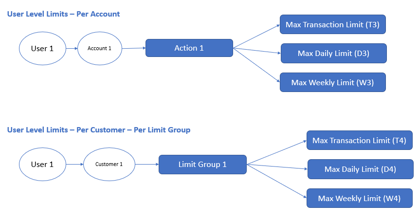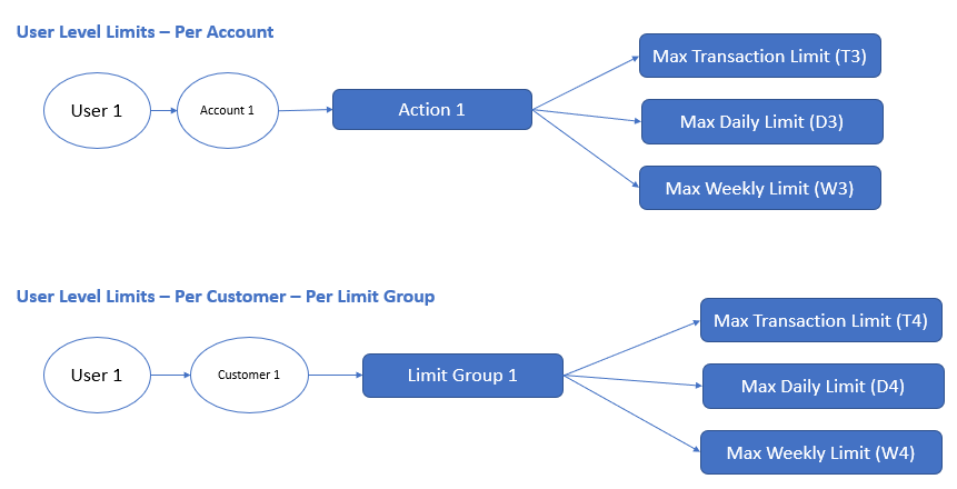 For a transaction to meet the allowed weekly transaction limit the following three conditions should be met. Take for instance that a transaction of value X is being made on Account 1 by User 1 using a action like Bill Pay → Create (Action 1). Also, that Account 1 belongs to Customer ID #1 and Action 1 is classified as Limit Group 1. Also, we can say that this specific user 1 has been assigned a role "Role1" on Customer 1.