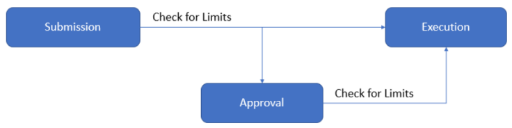 An authorized user can set the transaction limits (max transaction, daily, and weekly limits) at a user level for every monetary type of transaction. Based on these limits, a transaction can either be executed, be sent for approval, or be denied.