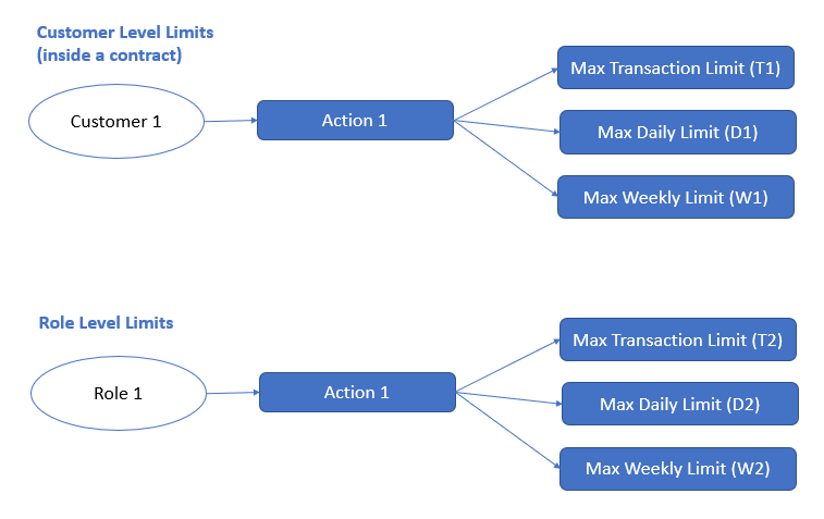 For a transaction to meet the allowed daily transaction limit the following three conditions should be met. Say for instance that a transaction of value X is being made on Account 1 by User 1 using a action like Bill Pay → Create (Action 1). Say also, that Account 1 belongs to Customer ID #1 and Action 1 is classified as Limit Group 1. Also, we can say that this particular user 1 has been assigned a role “Role1” on Customer 1.