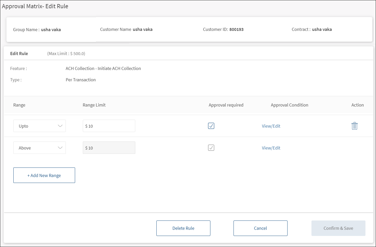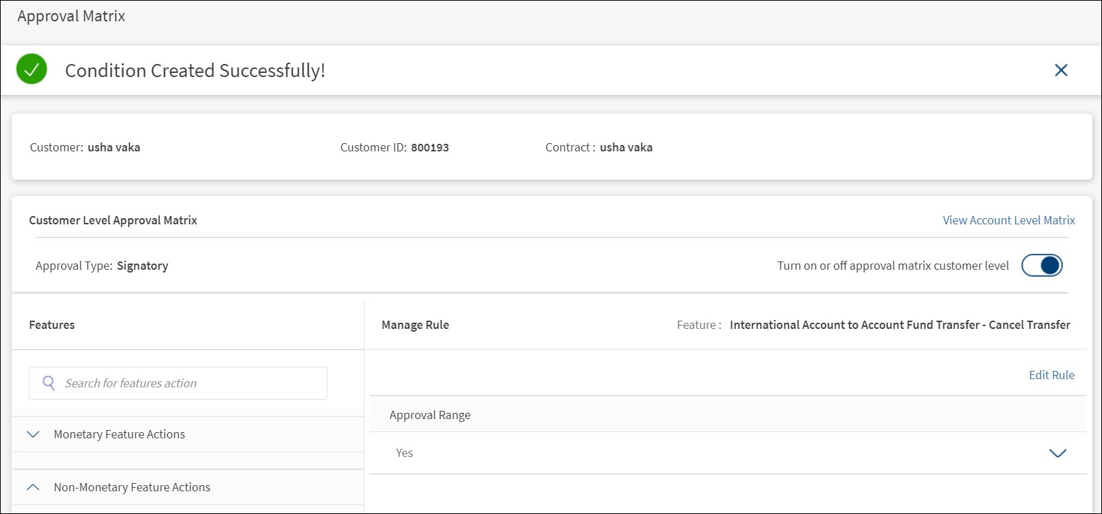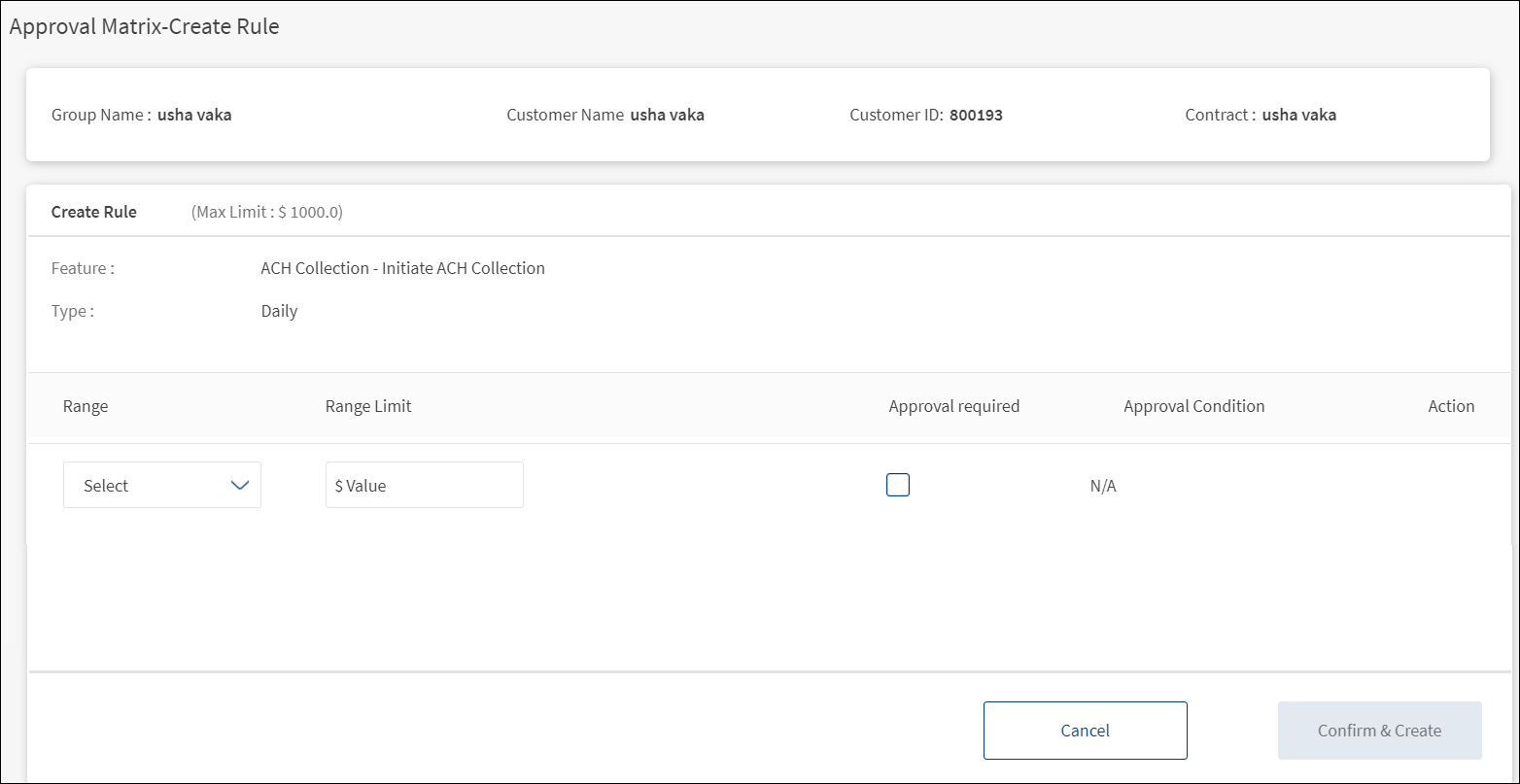 A user with the Create / Edit Approval Rules permission to set up approval matrix for a customer ID can define the rules in the matrix at the customer ID level. The user can add range of values and validations for the feature actions.