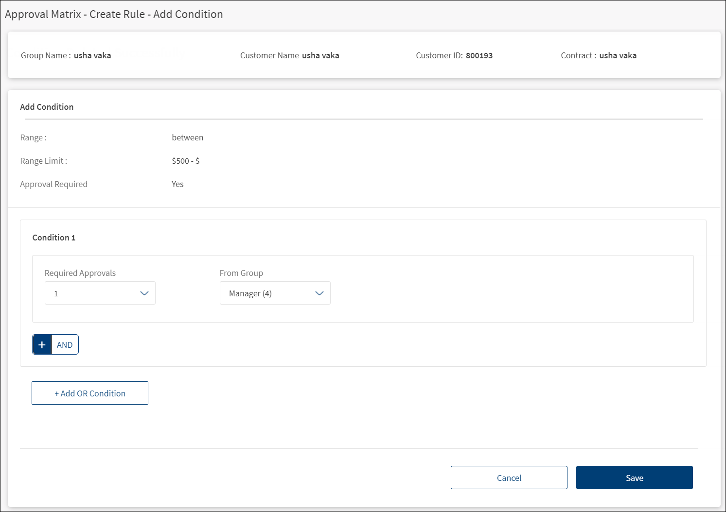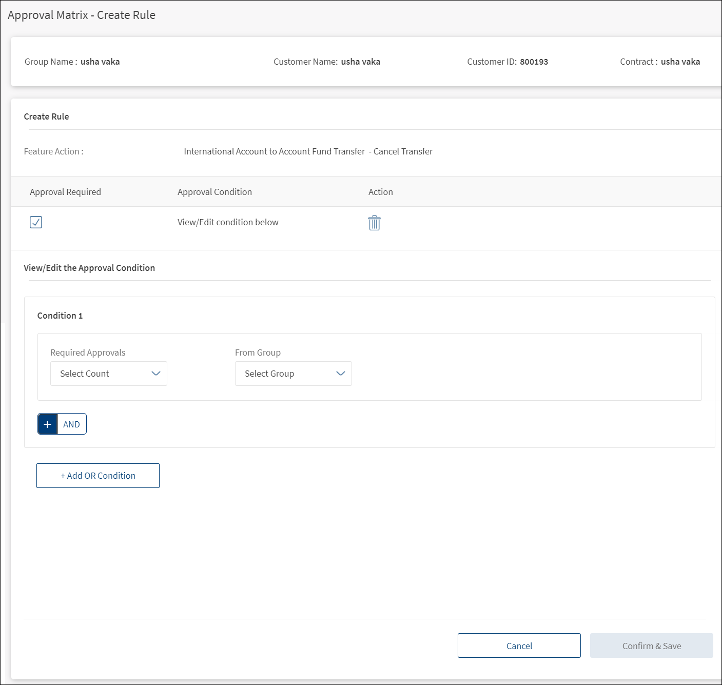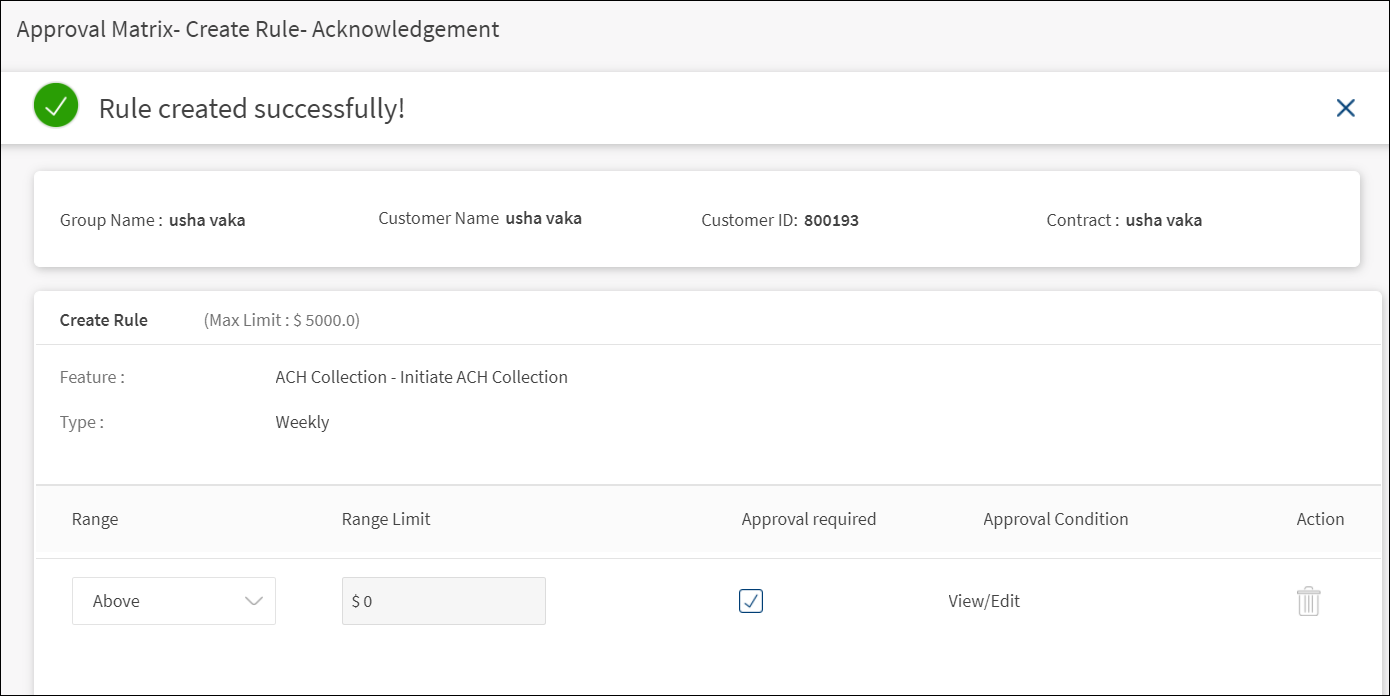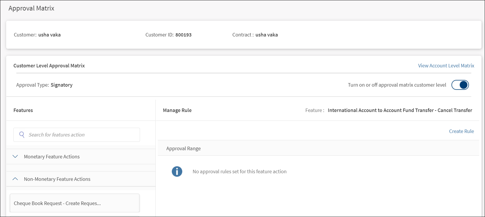 A user with the Create / Edit Approval Rules permission to set up approval matrix for a customer ID can define the rules in the matrix at the customer ID level. The user can add range of values and validations for the feature actions.