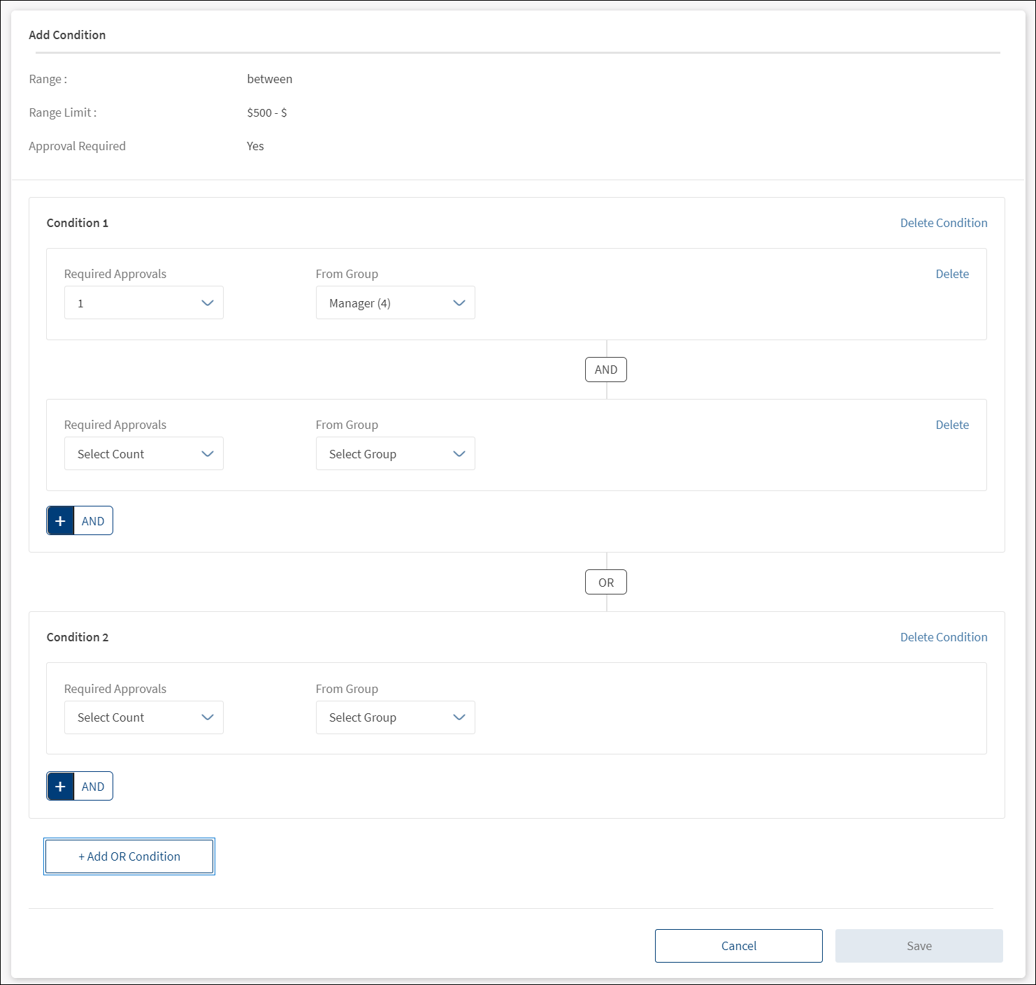 • Click the down arrow (accordion menu) to view the approval rules and conditions such as if approval is required, the number of required approvals (Any1), and from which signatory group (Manager) the approval is required.