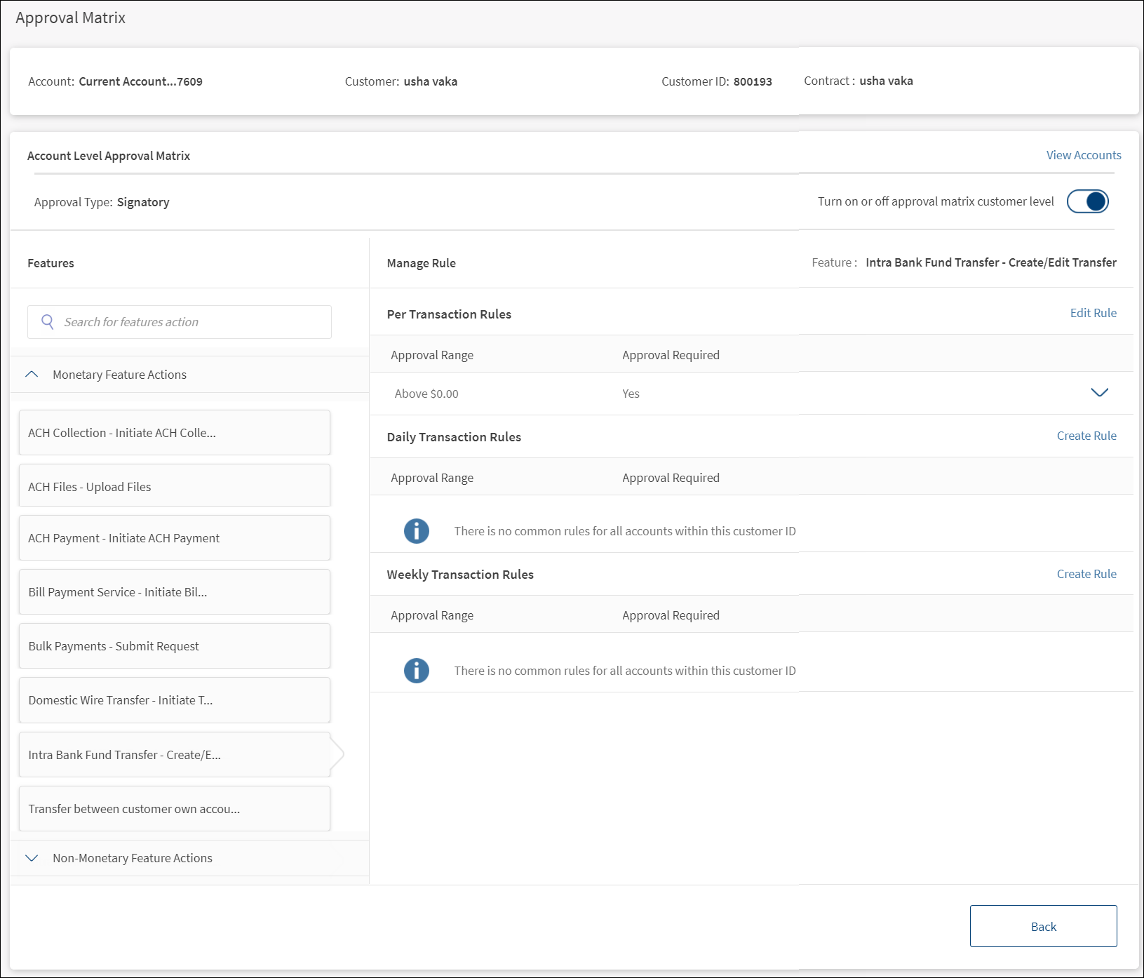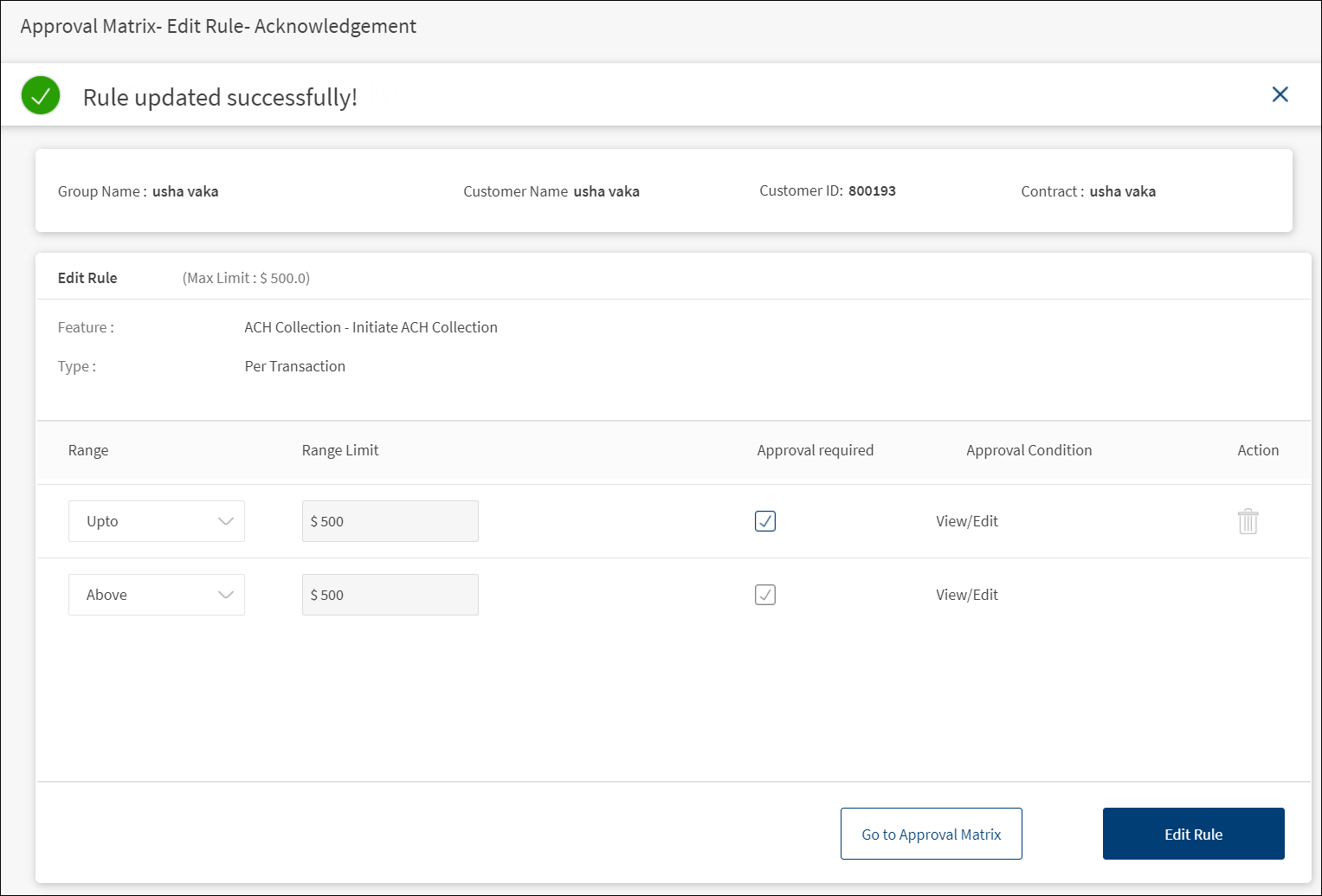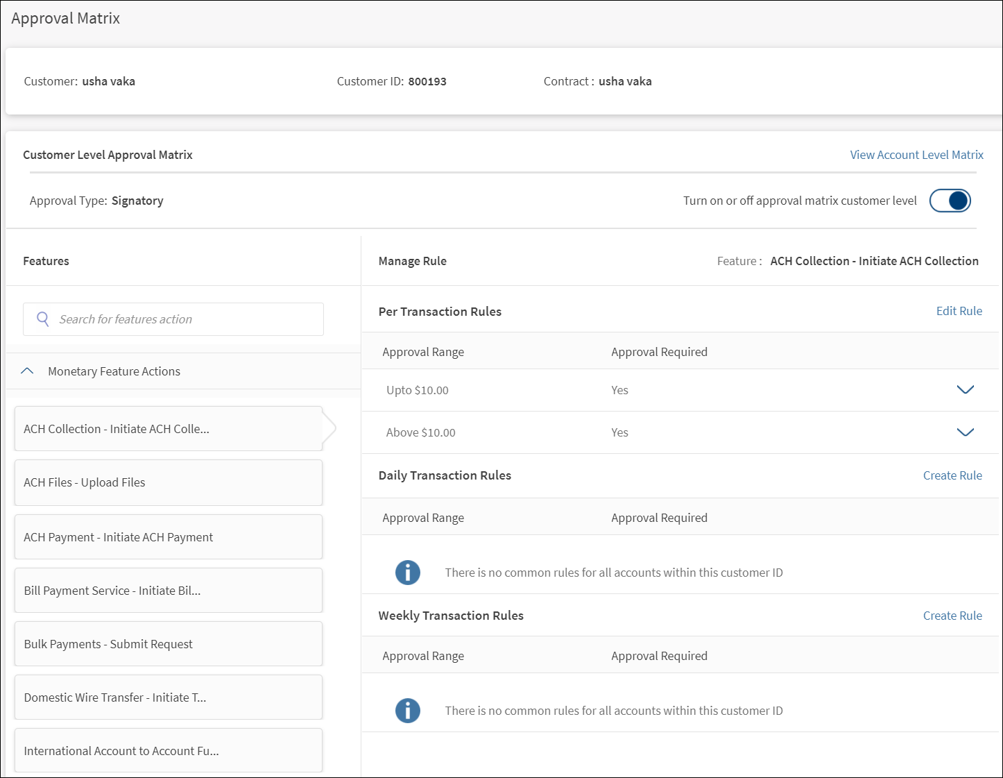 The form is the same for viewing and editing the approval matrix. A user with the permission to view/set up approval matrix for a customer ID can view the rules set up for the various monetary an non-monetary feature actions, and a user with edit permissions can edit the approval rule flow for individual actions at the customer level.