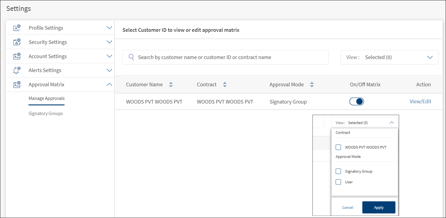 • View or edit matrix: Click the View/Edit Matrix link to view or edit the approval matrix for the selected customer. The link is visible only if the user has both View and Edit permissions of Approval Matrix for a specific customer. If the user has View only permissions for a specific customer, then View Details link is displayed.