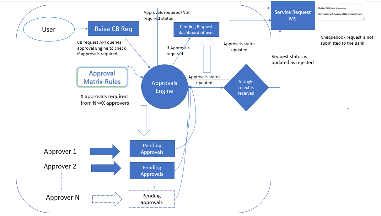 • Cheque book request flow. The flow diagram shows the chequebook request process where multiple approvers are involved and scenarios covering the approval and rejection processes.