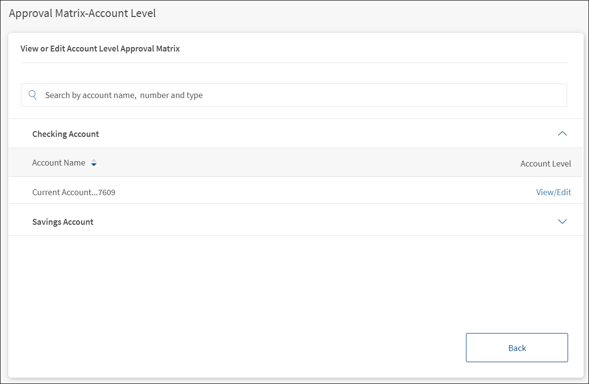 4. Click the down arrow of the required account and click the View/Edit link to modify the details of account level approval matrix. Use the Search option to search by account name, account number, or account type.