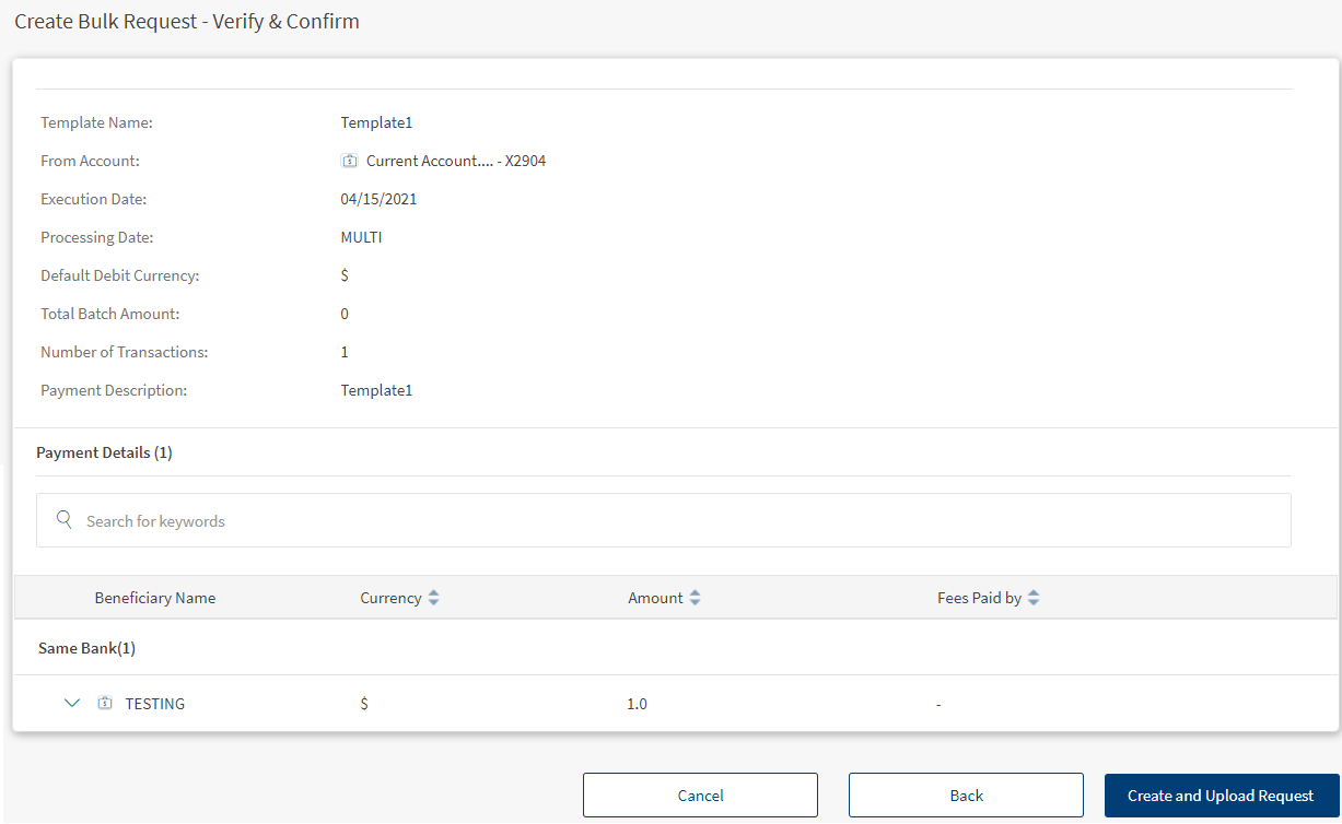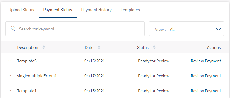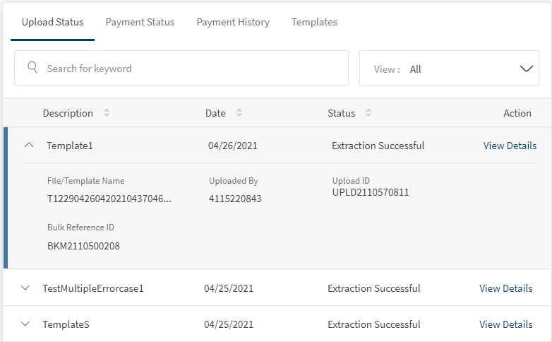 Use the feature to execute a bulk payment request using an already created template so that multiple payment details are uploaded by the user and the payments are initiated in a single instance.