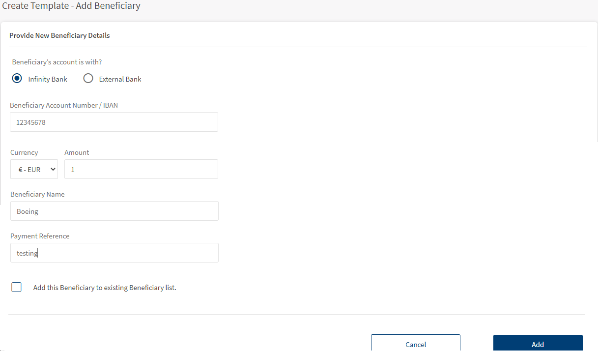 - Select the Add this beneficiary to existing beneficiary list check box to add to the list of registered beneficiaries. This step is optional.