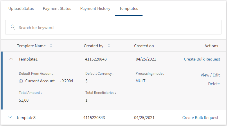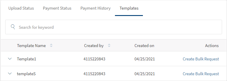 - On the Templates tab, from the list of templates, click the Create Bulk Request link of the template using which, the bulk payment request is made. The templates should have already been created. See Create New Template for more information.