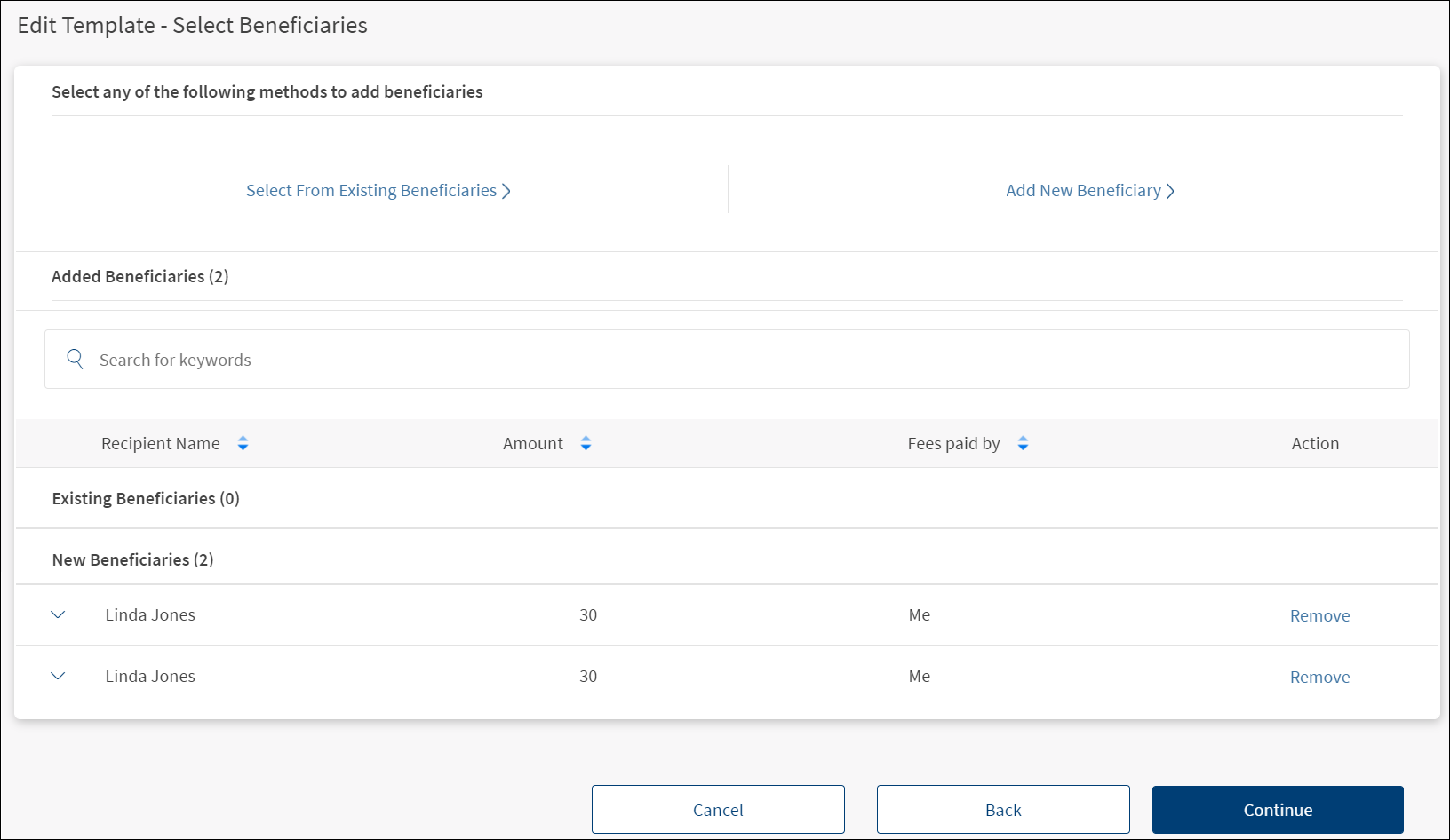 - View All Removed Beneficiaries: When editing an existing template and removing beneificieries, the user can view the list of remove beneficiary and add it back if needed.