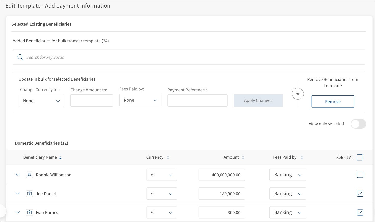 - Change the currency (applicable only if the processing mode is Multiple) and payment amount of individual beneficiaries.