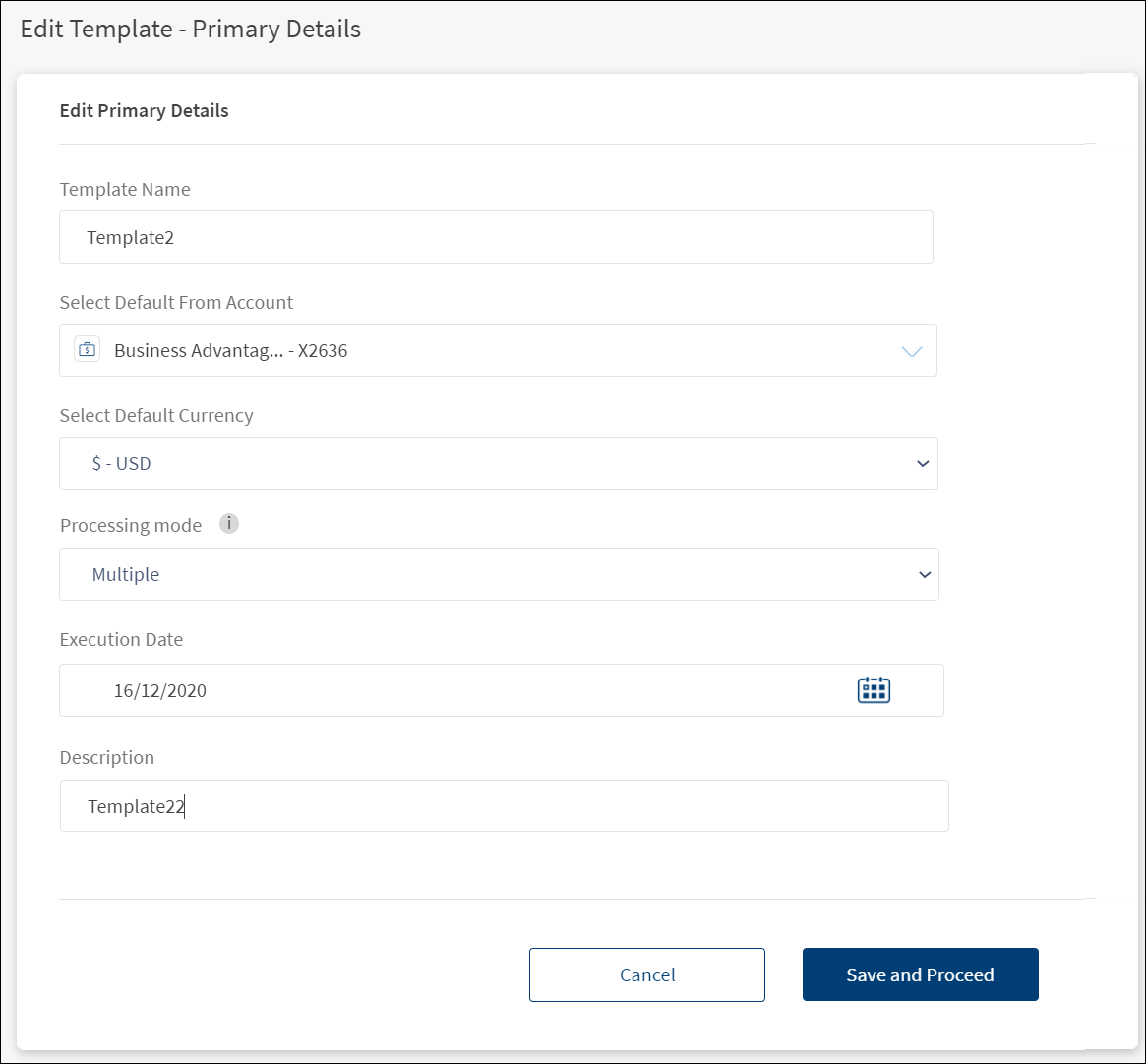 - If the Processing mode of the template is Single, the Currency is the default currency selected on the primary details screen and cannot be changed. If the Processing mode is Multiple, the user can define the Payment currency.