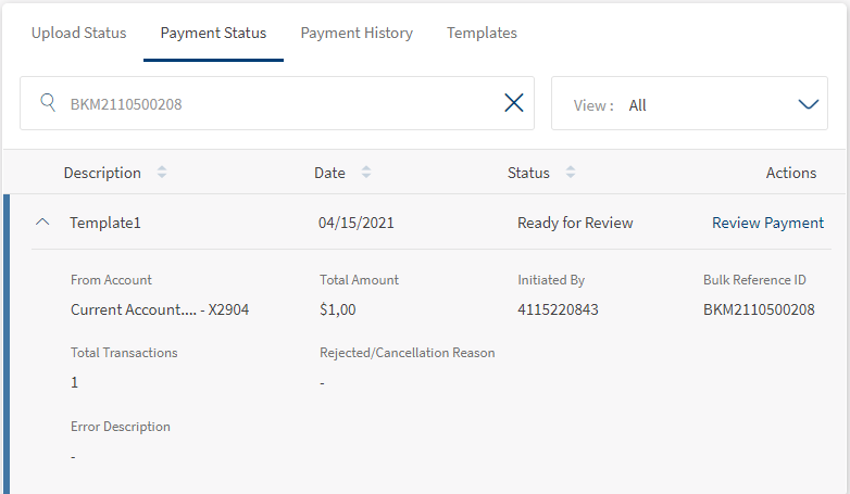 - If the bulk payment record initiated is displayed in the Payment Status dashboard with error description, you must cancel the request and upload a new file as the error is not amendable.