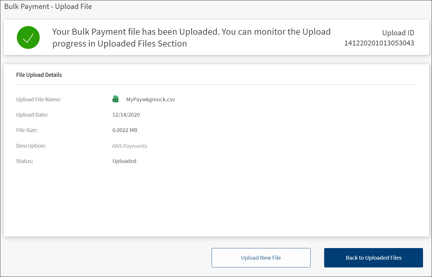 | UploadFile | This API uploads the Bulk Payment File. | 2020.10 |