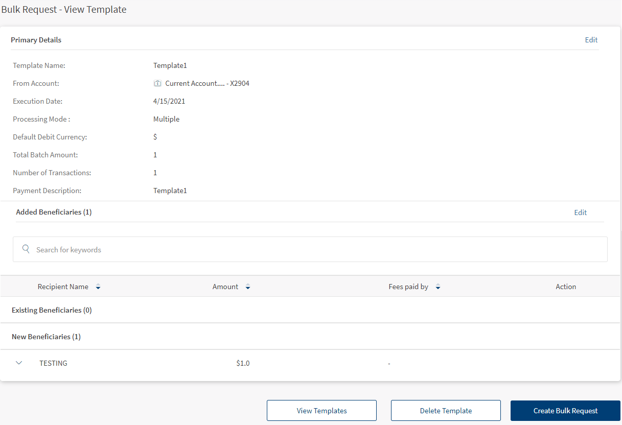 Use the feature to create new templates for bulk payments by entering primary and beneficiary details.