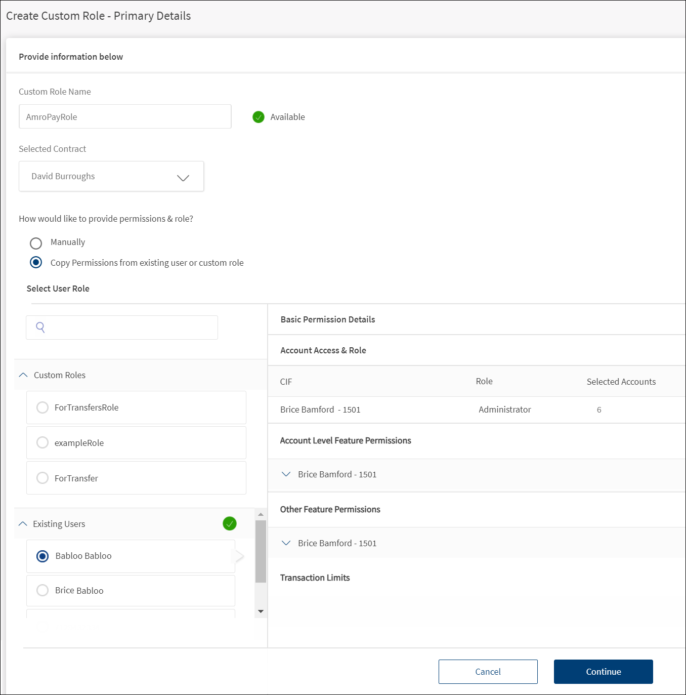 Review the details that you have already entered and modify the account level permissions to features and define transaction limits as required. The permissions and transaction limits are set up based on the mode you selected to create the custom role - assign permissions manually or copy permissions from existing user or custom role. You can modify the permissions to features now or review and change the details later.