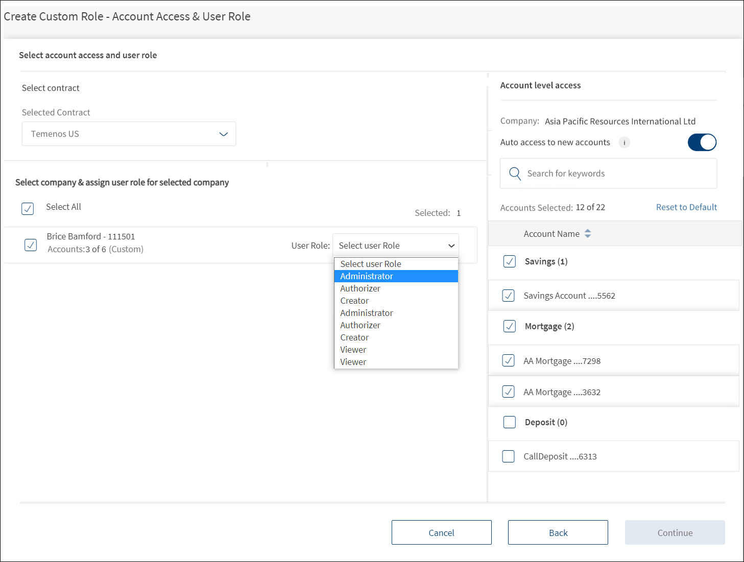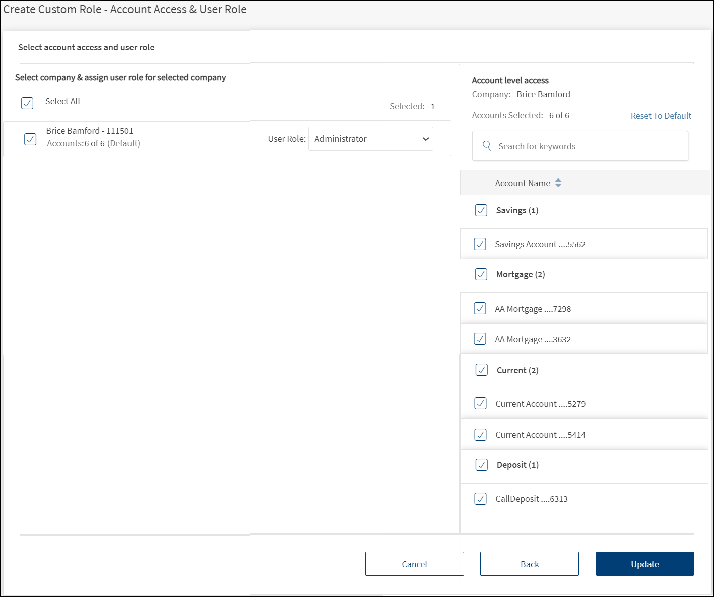 - Select the required accounts under Account Level Access on the right pane. The user who is assigned with this role will be able to view or operate only the selected accounts when the user signs in to the application. It is mandatory to select at least one account.