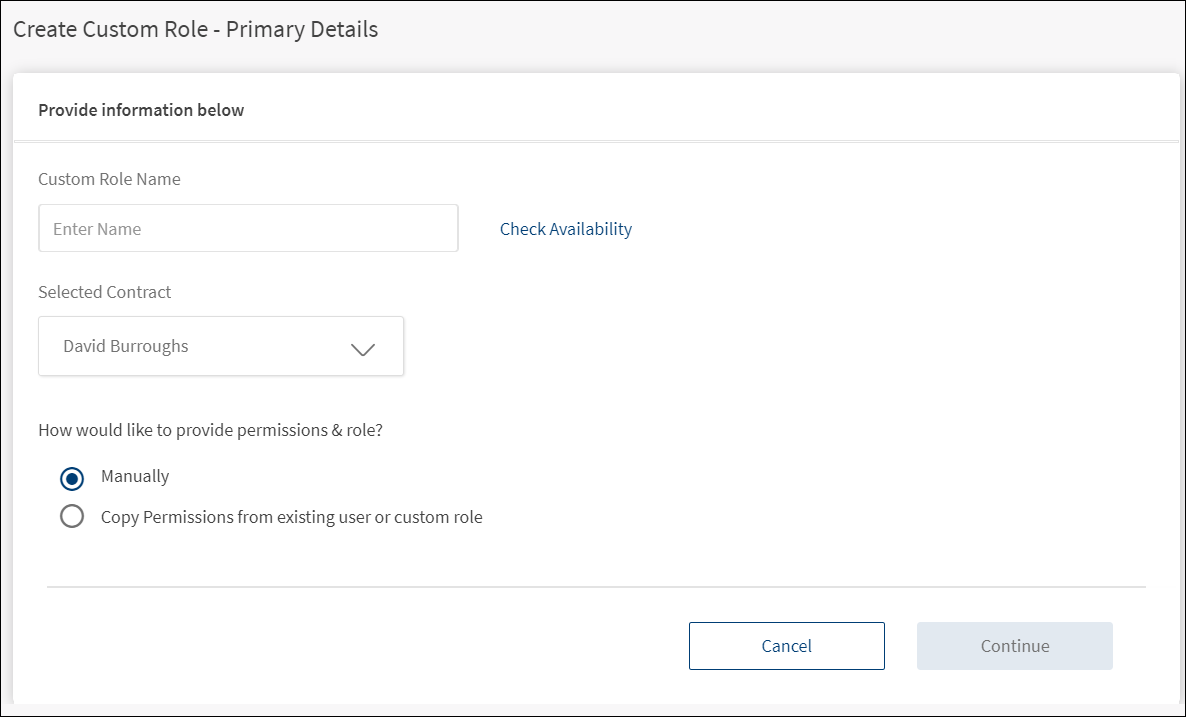 - Click Continue. The Continue button is enabled only if a valid custom role name is entered.