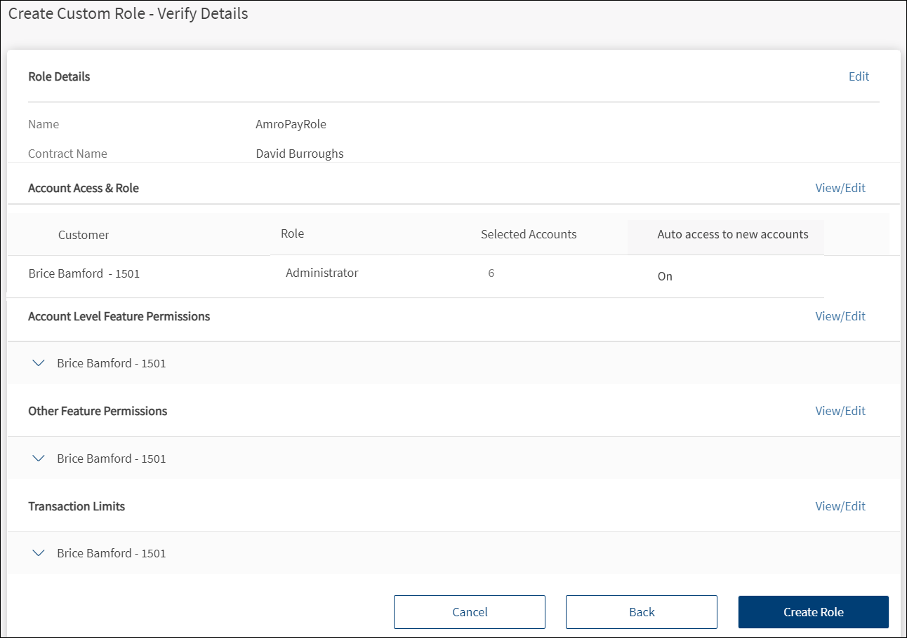- After reviewing the custom role details, permissions to features, and defining the transaction limits, click Create Role to submit the form.