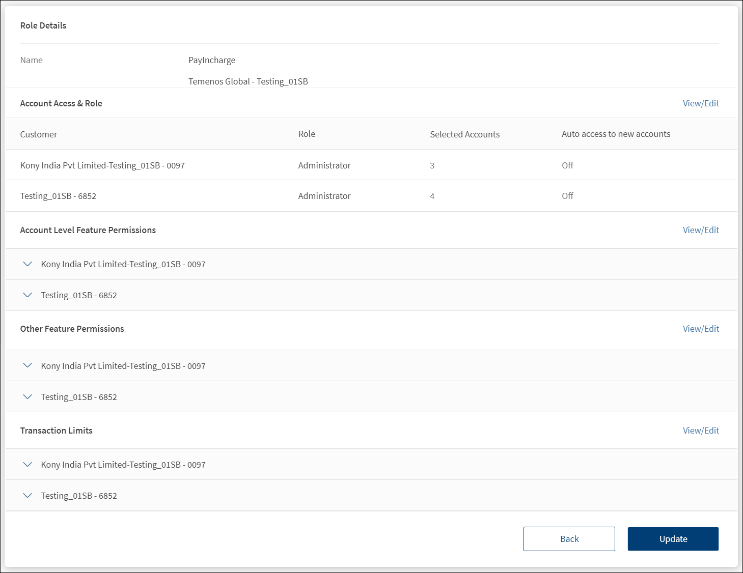 - Role. Assign a new role if required and click Update. The change is updated. The feature permissions and transaction limits changes based on the role.