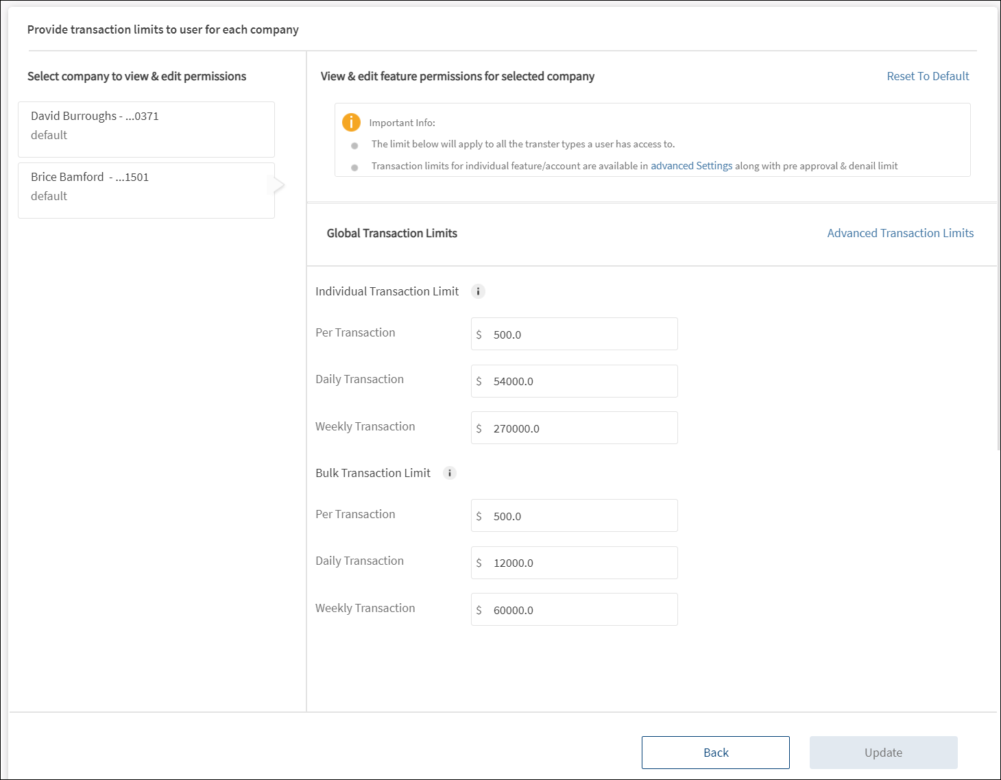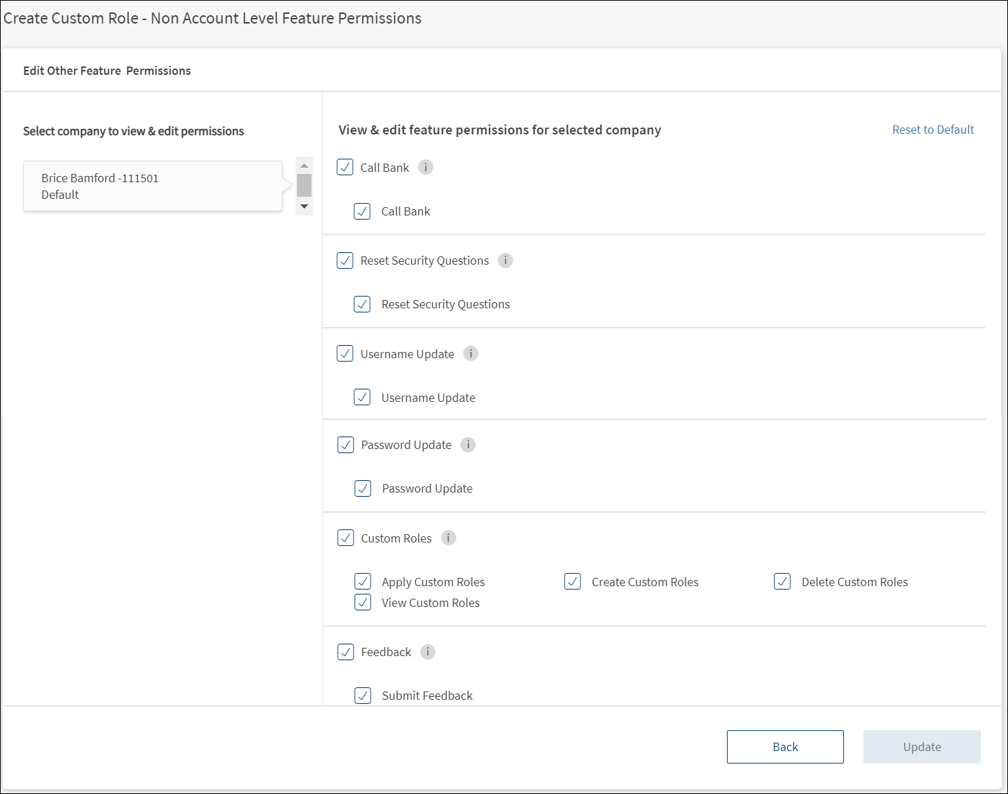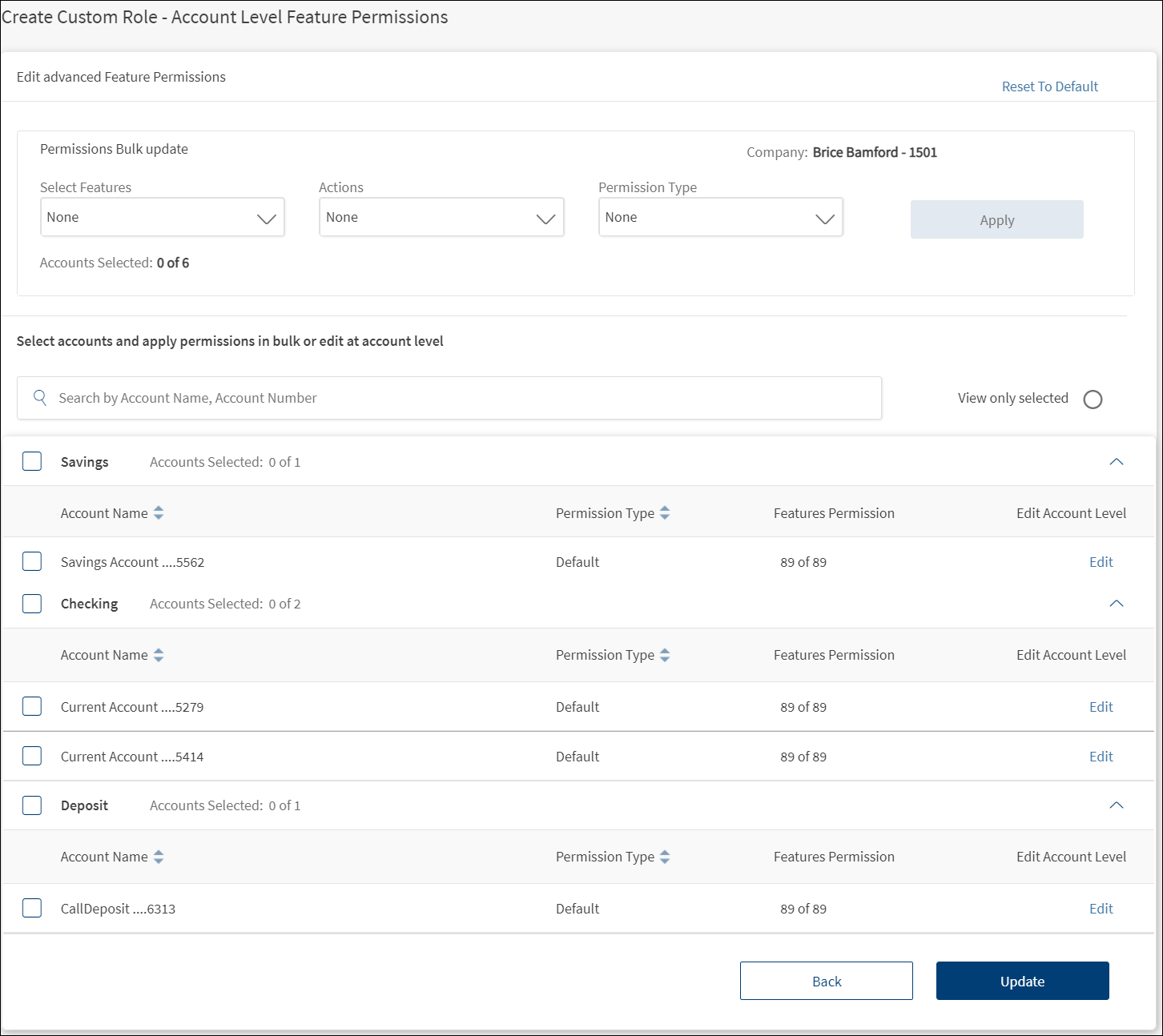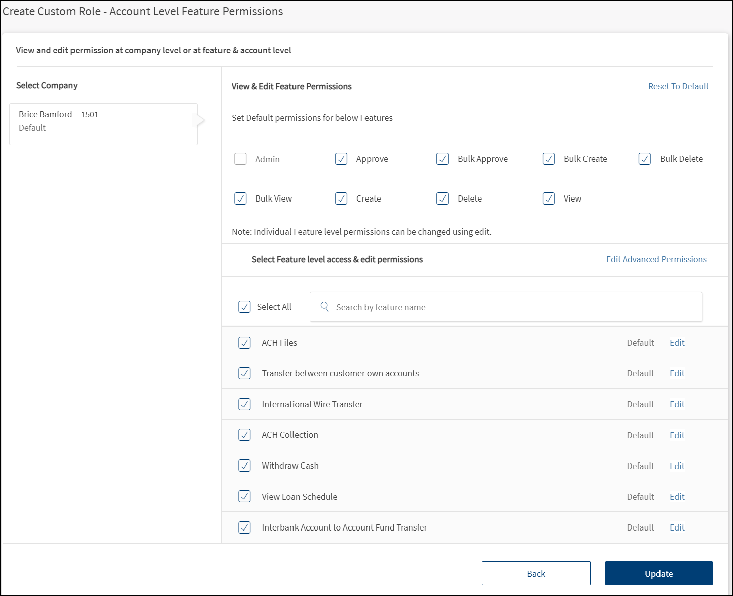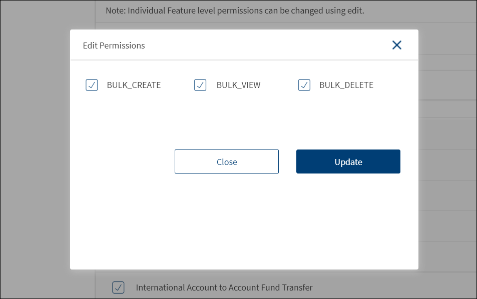 Account Level Feature PermissionsDisplays the permissions to access the features and associated actions for the selected Customer ID. Make the changes by selecting or clearing the feature check boxes of respective accounts. Click Update. The changes are updated. The permissions and transaction limits changes based on the changes.