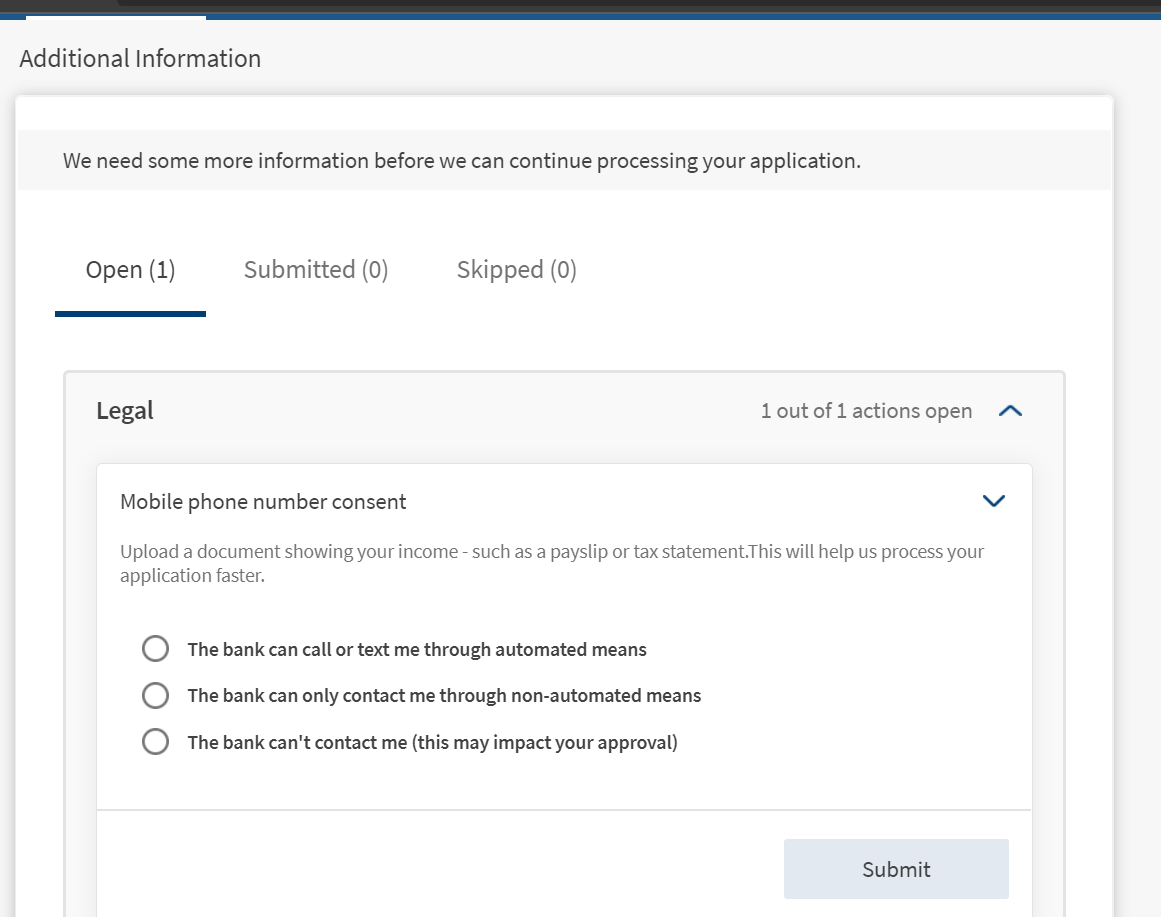 The Additional Information section (Customer Actions module) allows Financial Institutions to request ad-hoc information from end-users, customers or prospects, automatically via the execution of the business process. For instance, this section can contain questions related to Income details, Legal details, and additional information. The questions in these segments request data in various ways such as Radio-Button Selection, Single-Selection dropdown list, Currency, Date, and Document Upload. Currently the Additional Information section is as follows.