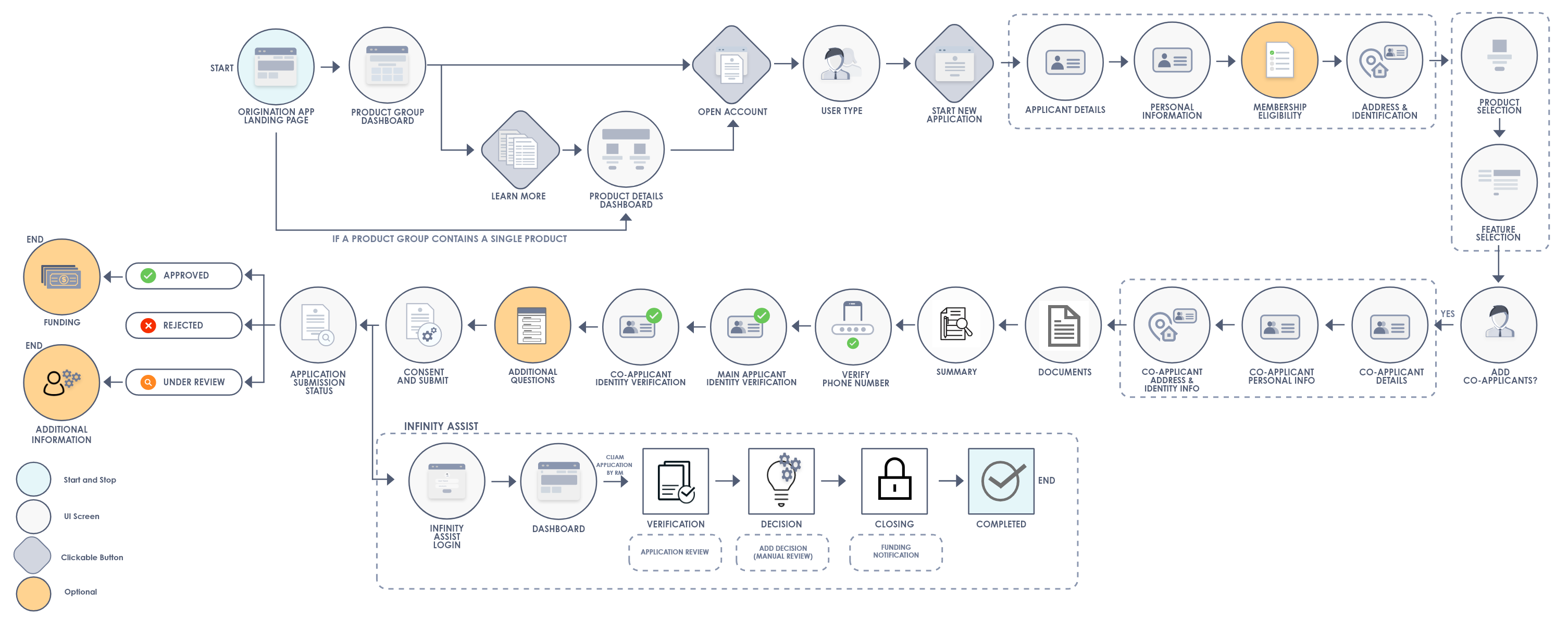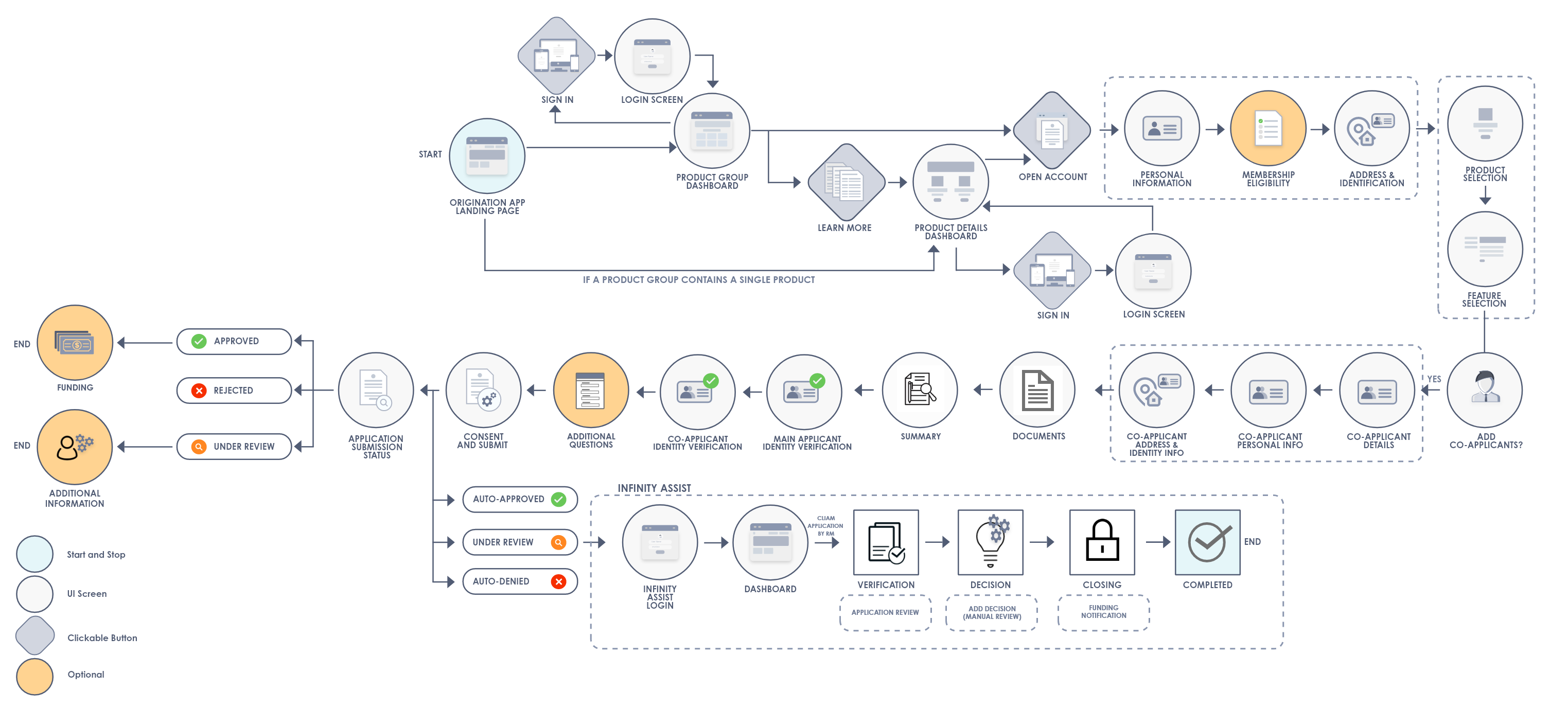 The following flow diagram illustrates the Origination app flow in this scenario. - Non-Existent User With Co-Applicant: This scenario applies to a new user who wants to open a new account, with a co-applicant.