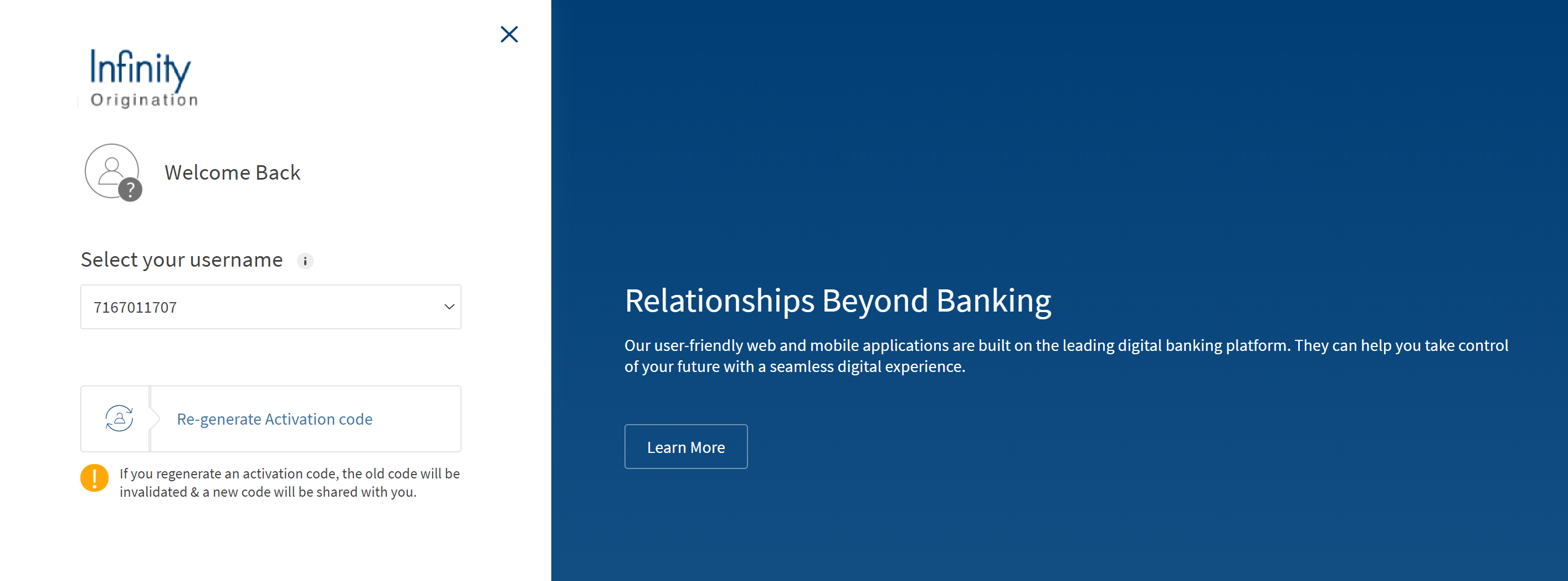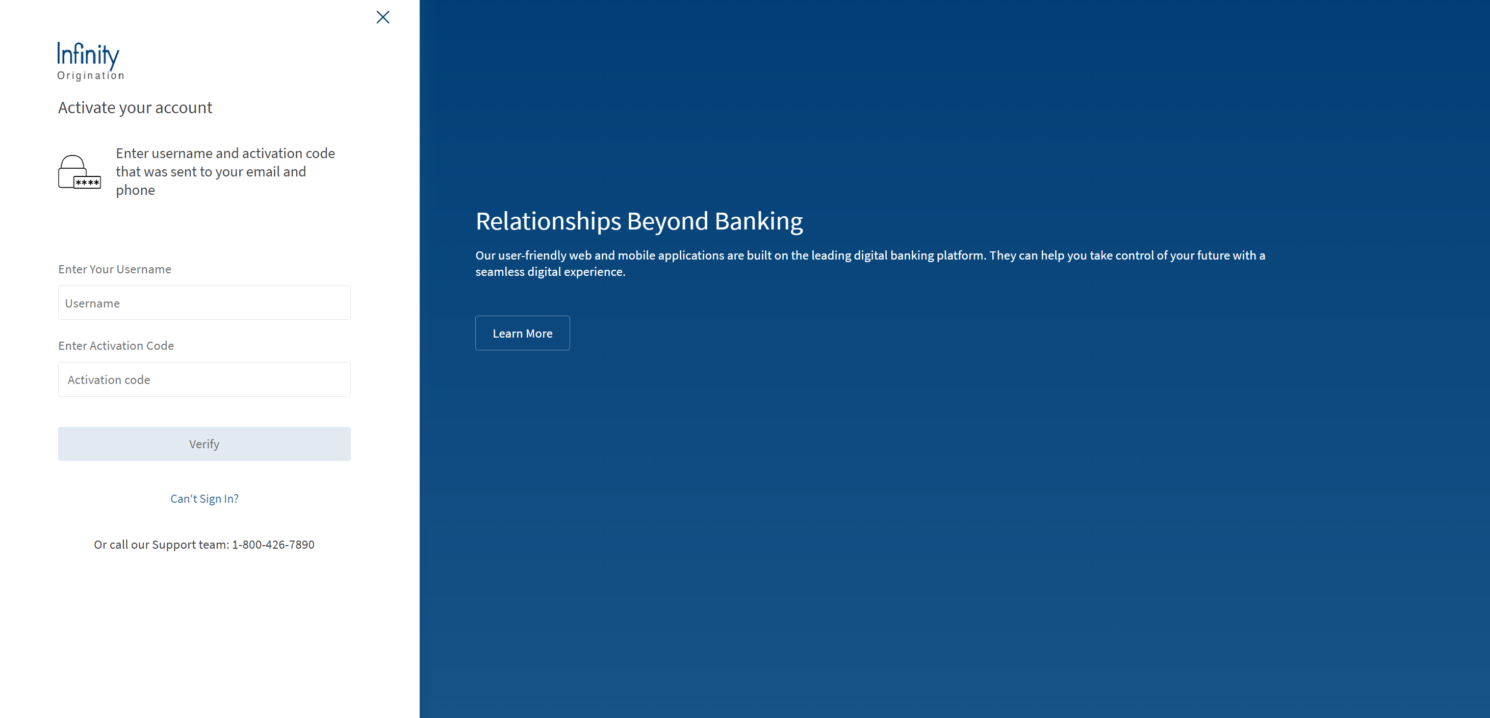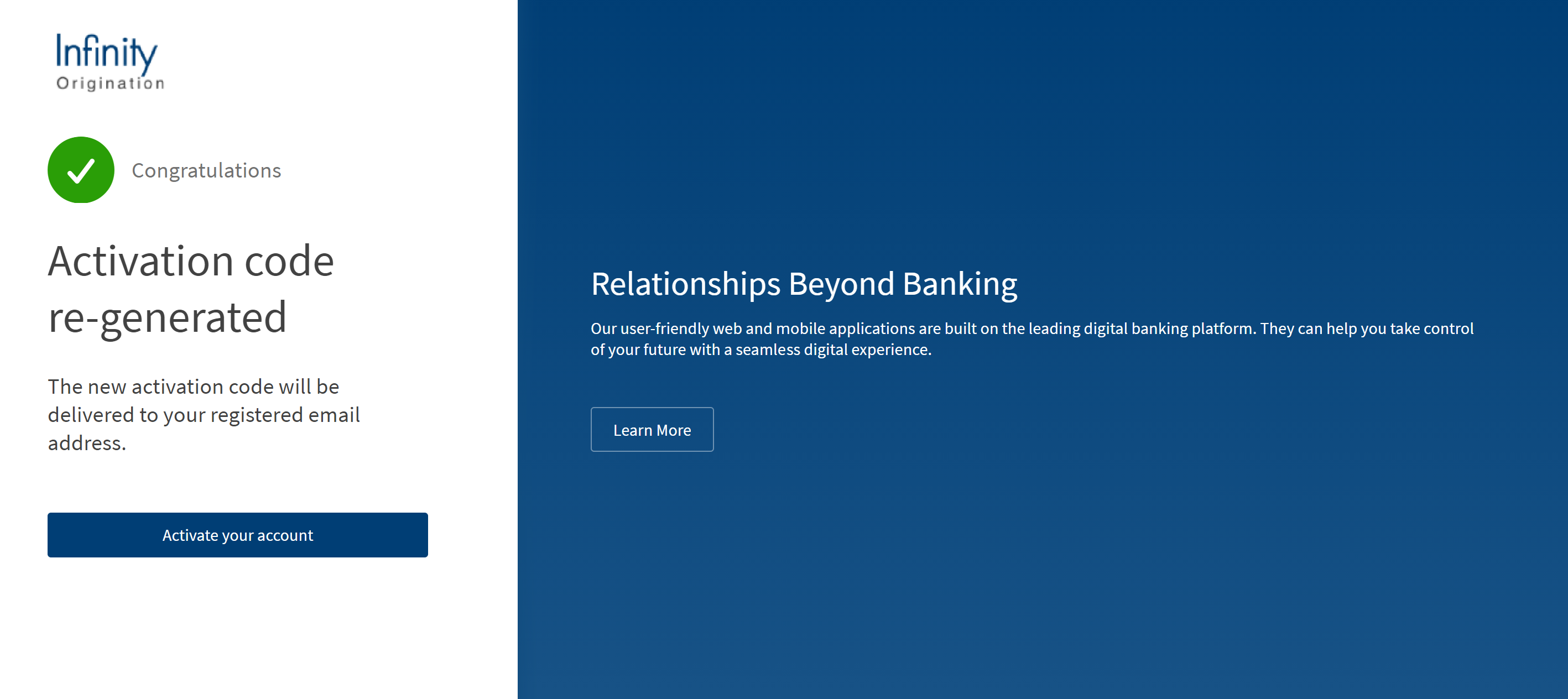 A new activation code is sent to your registered email address and the screen displays that the Activation code is re-generated. - Click Activate your account. Then, enter your username and the activation code, and click Verify.
