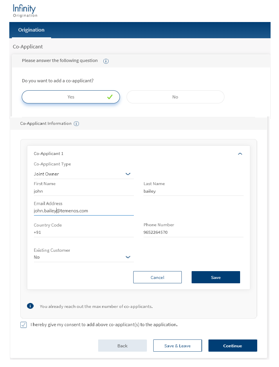 When main applicant has to add a co-applicant in the Co-applicant screen, Main applicant must select the checkbox to proceed to next screen as I hereby give my consent to add above co-applicant(s) to the application.