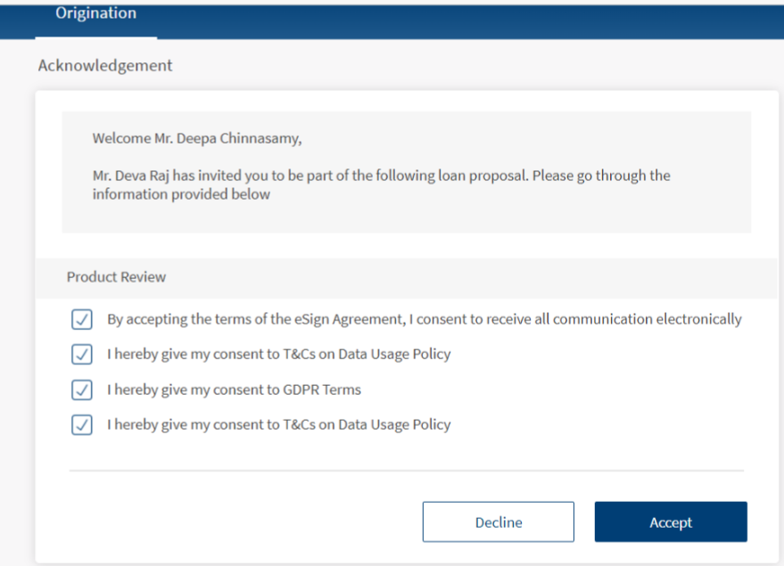To initiate the application either as a Prospect, or as an Existing customer or a Related party must abide and provide your consent in the login screen of the Origination App.