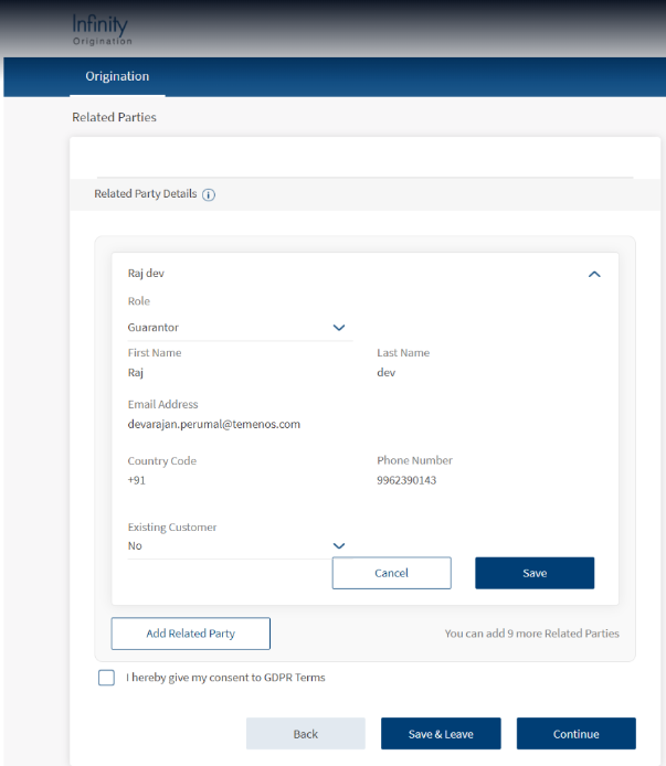 When Main applicant has to add a Related party in the Related party screen, Main applicant must select the checkbox to proceed to next screen as I hereby give I hereby give my consent to add above related party(s) to the application.
