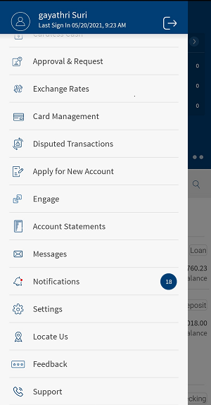 From the bottom menu, tap Menu > Support. Alternatively, you can tap Support from the footer of the login page. The app displays Support screen with FAQs, Terms and Conditions, Privacy Policy, Bank Timings and Call Us option.