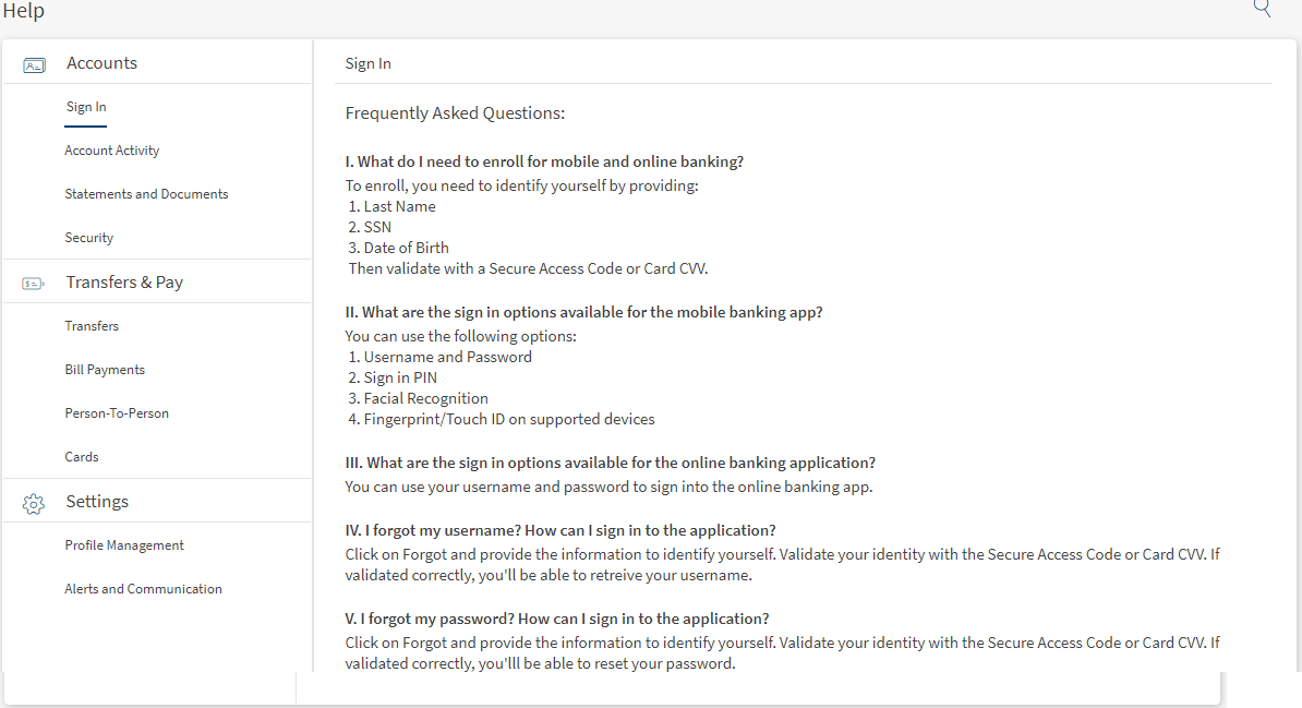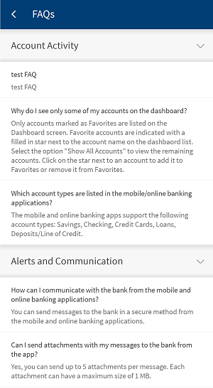 In online banking, the FAQs are grouped by categories based on the various activities that can be performed in the application. These FAQs are fetched from Spotlight (Customer 360). The available FAQ categories are: