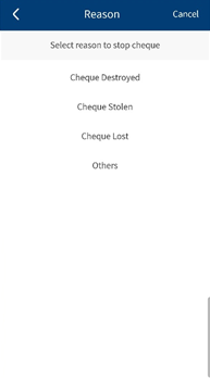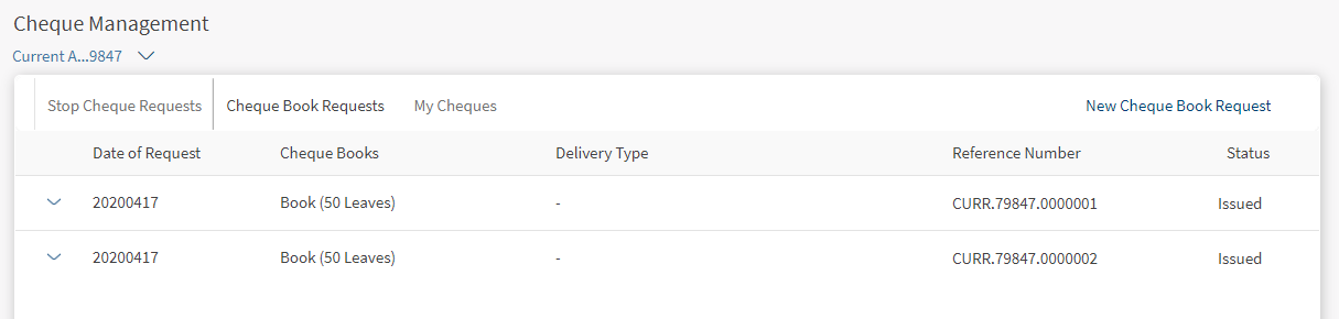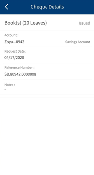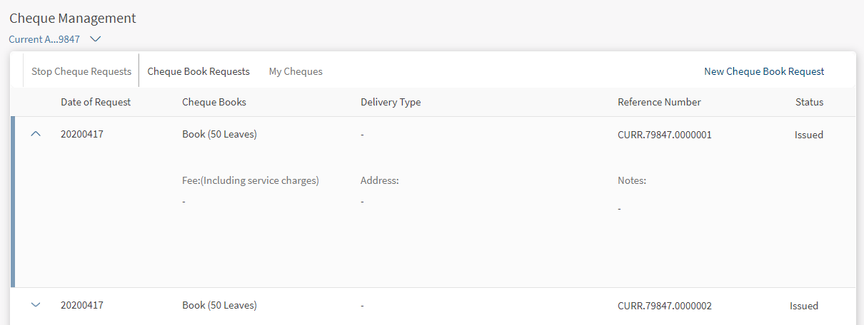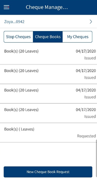 - View the list of chequebook requests and the status of raised requests.