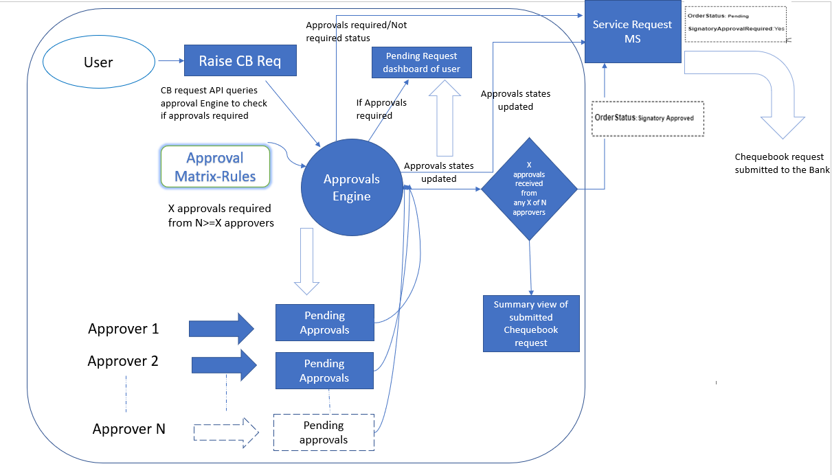 | Check book request – Approvals required | User (Initiator) triggers cheque book request |
