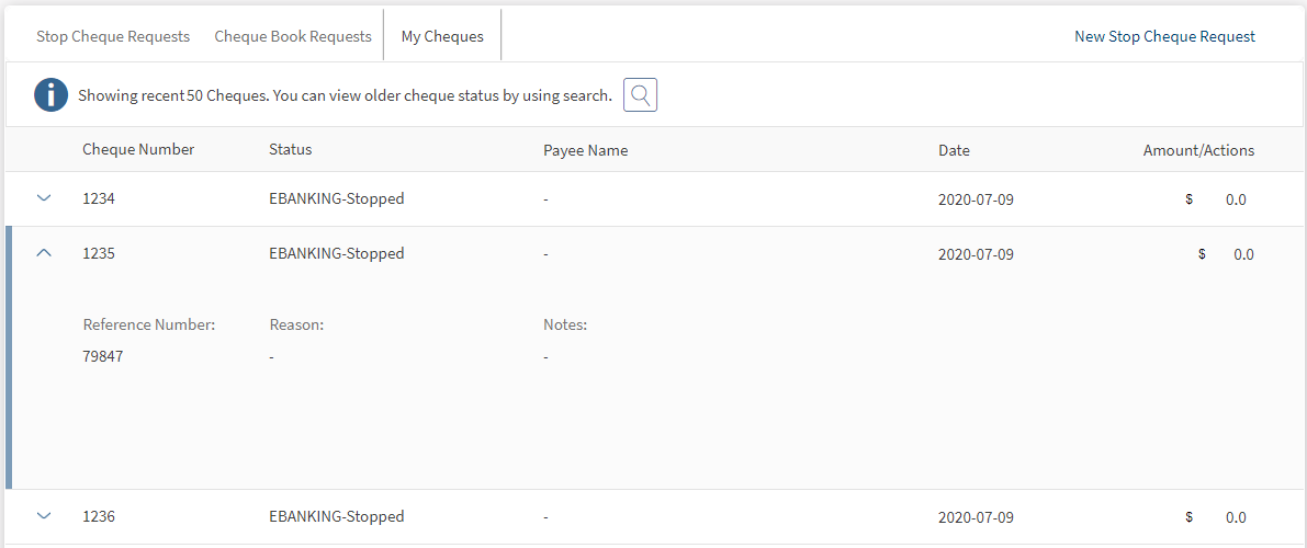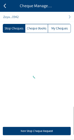 - Click on Cheque Management from the side menu. Stop Cheque Requests tab is displayed by default.