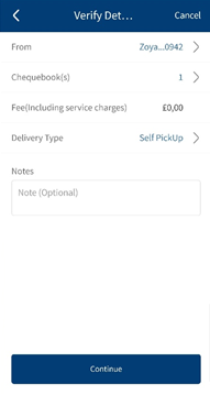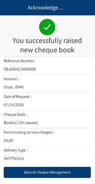 - Choose between delivering the chequebook to the mailing address or pick up from branch.
