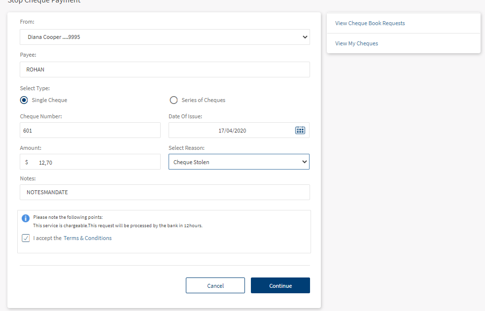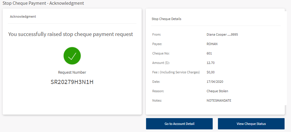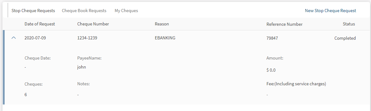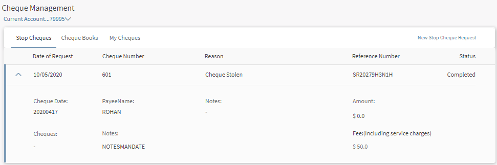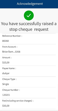 - Raise a new stop cheque request