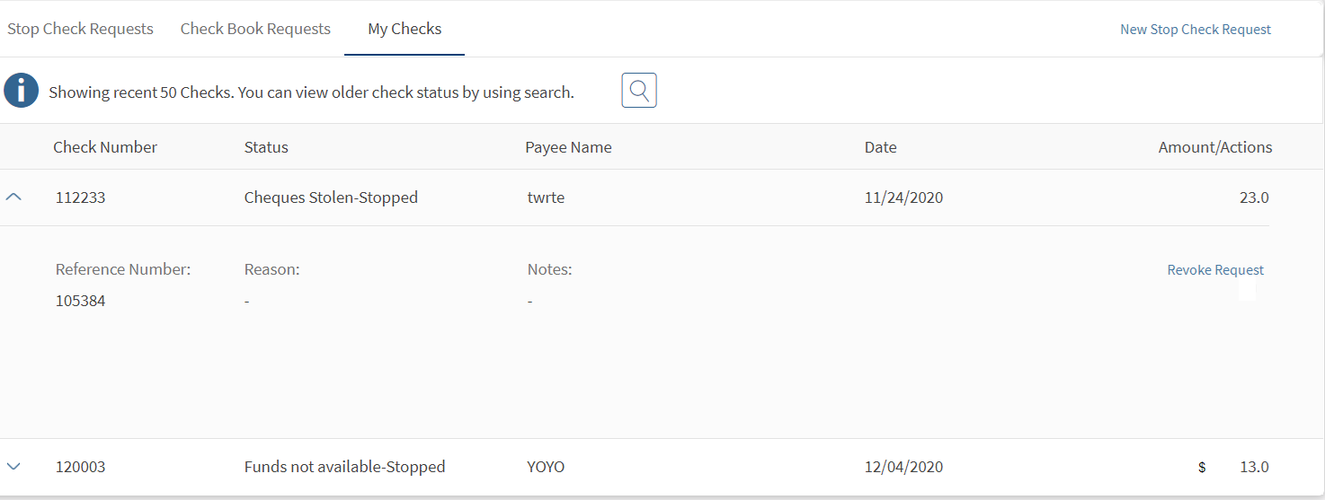 - Revoke Stop Payment Request feature must be active to revoke a cheque with status Stopped. Additionally, stop payment request feature must be active. Once both the features are active, the Revoke option in My Cheques screen is enabled to revoke the stop payment of the cheque.