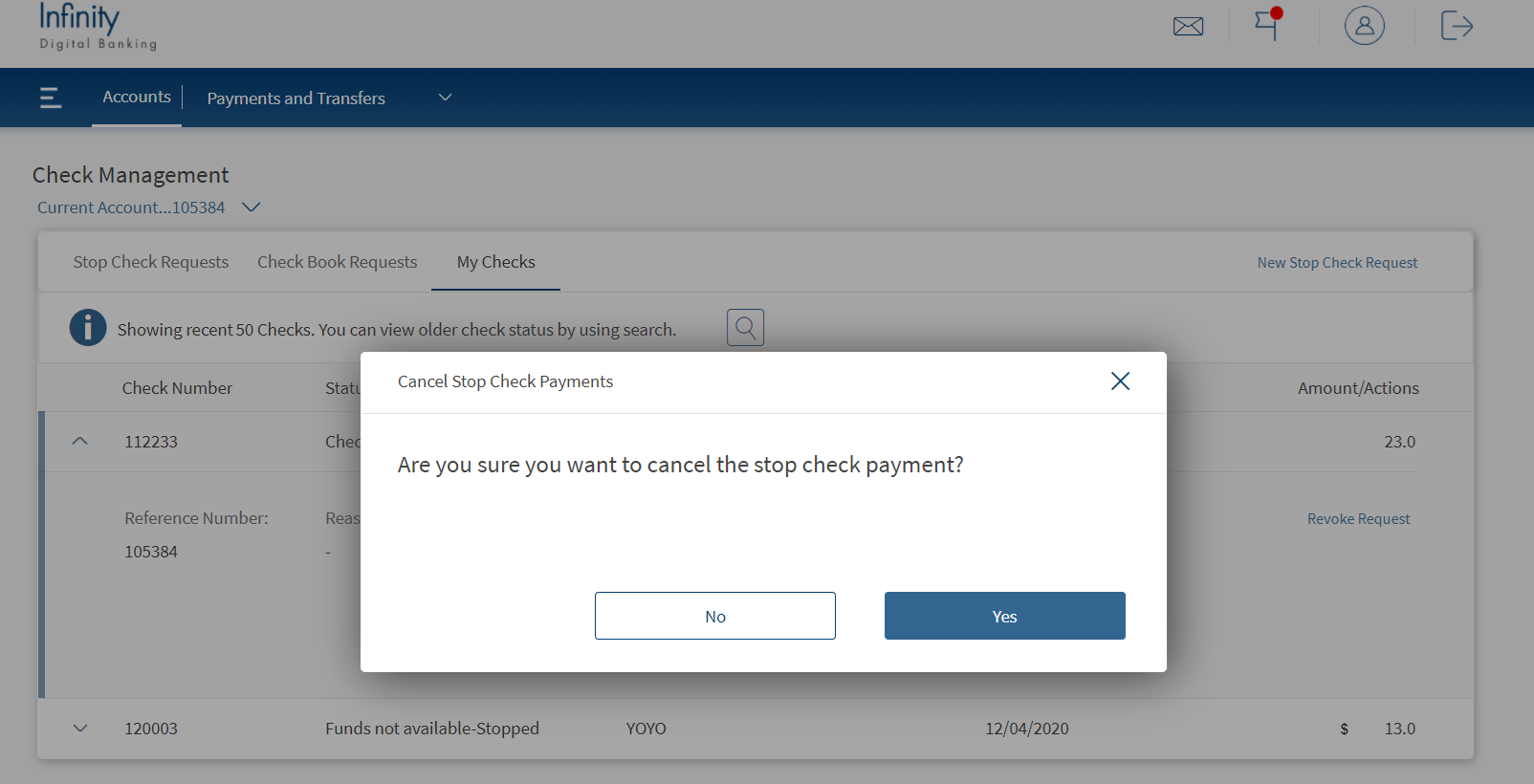 - A pop-up appears for the confirmation. Click Confirm to revoke the Stop Payment Request.