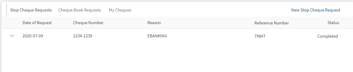 - Click Cheque Management from the side menu. The Cheque Management screen appears with the Stop Cheque Requests tab highlighted.