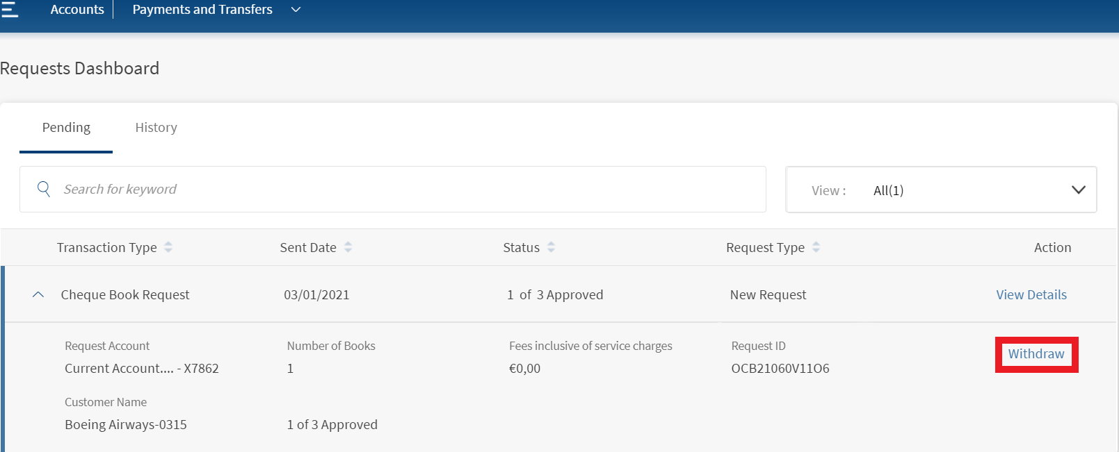 You can withdraw your chequebook request from the Approvals and Request dashboard. Follow these steps to withdraw chequebook request: