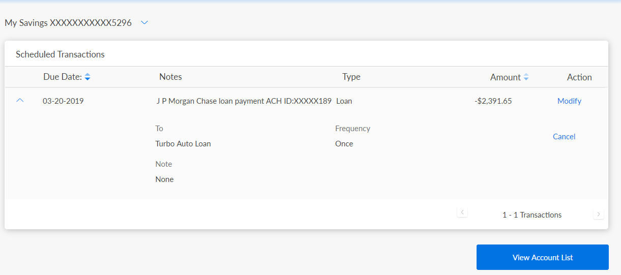 - Click View Account List to go back to Account Details and Transactions screen.