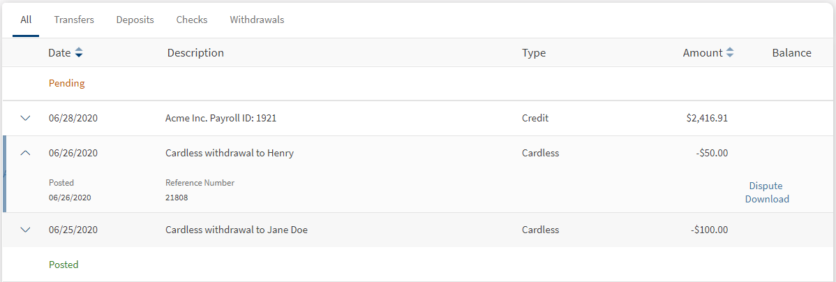 - Click any of the tabs (Transfer, Deposits, Checks, and Withdrawals) to view the corresponding transactions under Pending or Recent.