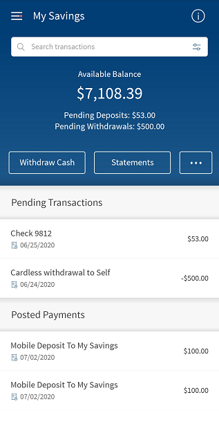 Example: If the Savings account is selected, the app shows the Transfers, Deposits, Checks, and Withdrawals tabs.