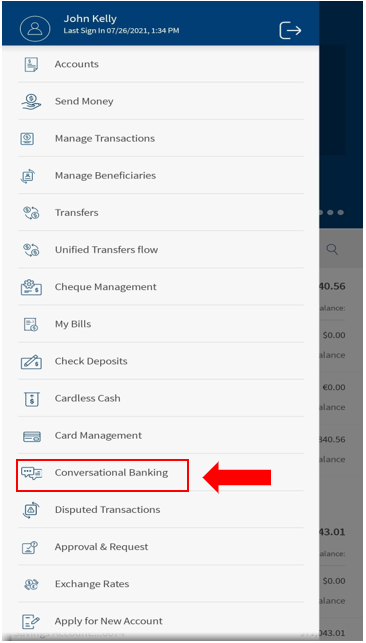 Use the feature to view your account balance, Transactions, view your card details, block any of your registered cards, view your payments, update your profile, and more. Conversational Banking Platform (CBP) supports the conversations through auditory and textual methods. CBP is NLP-capable, therefore, you need not write explicit commands such as “Account Balance”, every time you use the Chatbot; you can speak your mind, choose the predefined items, or enter your text. This feature is available only in mobile banking application.