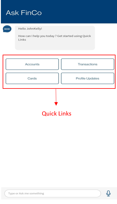 To chat with Ask Finco, the Chatbot, use the predefined items, enter text in the box, or tap the microphone icon and speak.