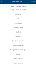- Category. Select the category to send the message such as Change Account Ownership, Account, ATM, or Credit Card.