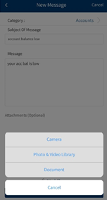 - For mobile banking, tap Attach File and select the required options such as Camera, Photo and Video library, and Document to attach the file.